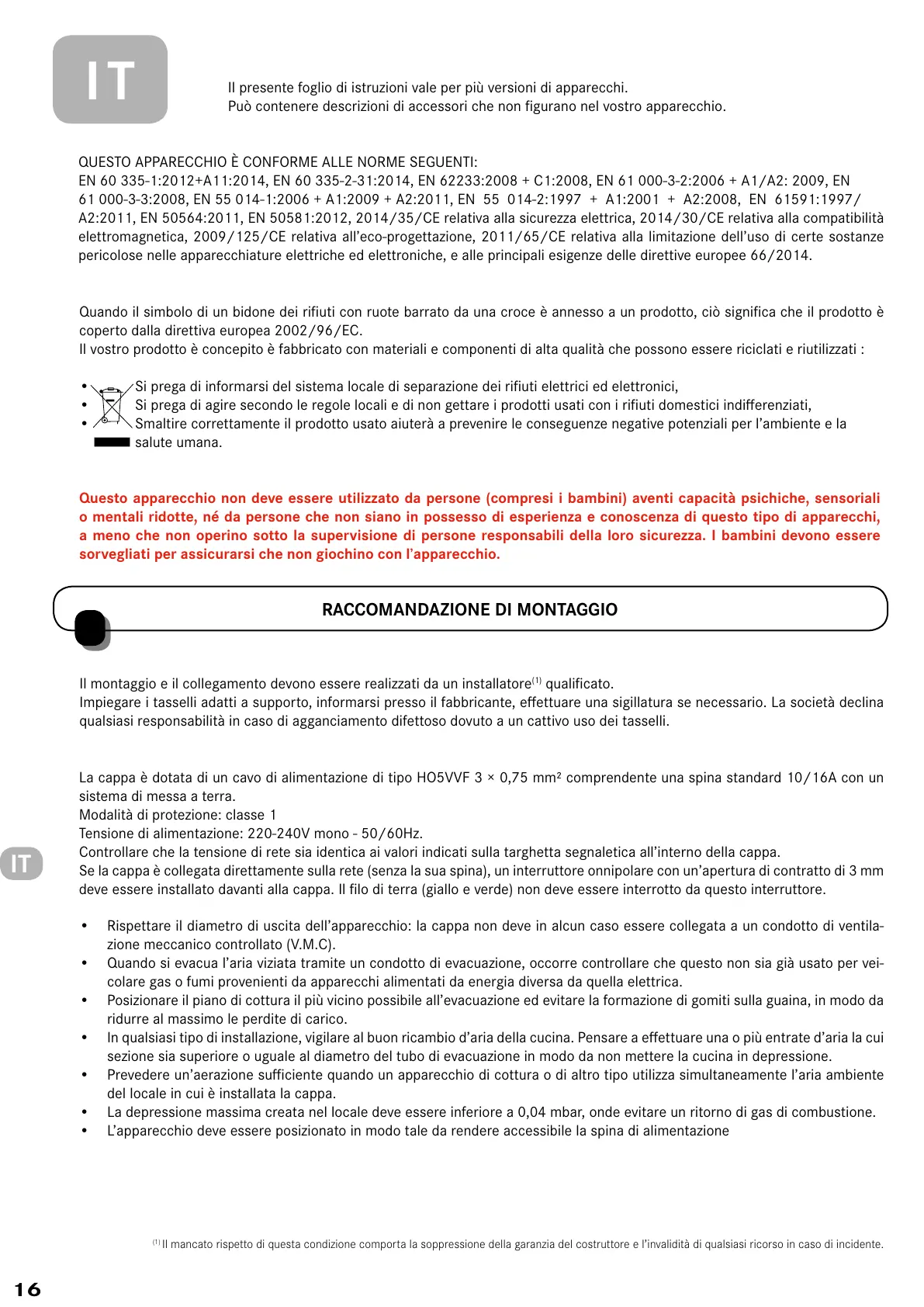 La cappa è dotata di un cavo di alimentazione di tipo HO5VVF 3 × 0,75 mm² comprendente una spina standard 10/16A con un