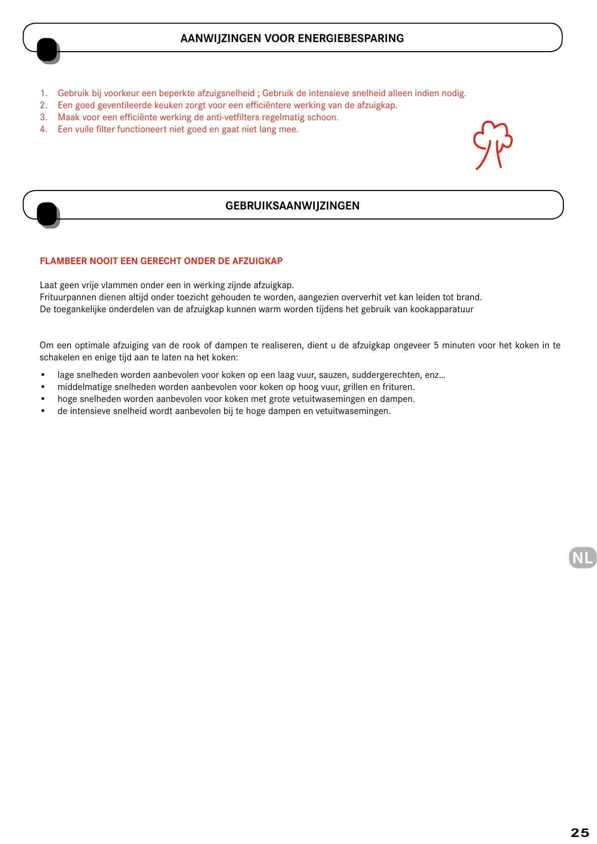 1. Gebruik bij voorkeur een beperkte afzuigsnelheid ; Gebruik de intensieve snelheid alleen indien nodig.