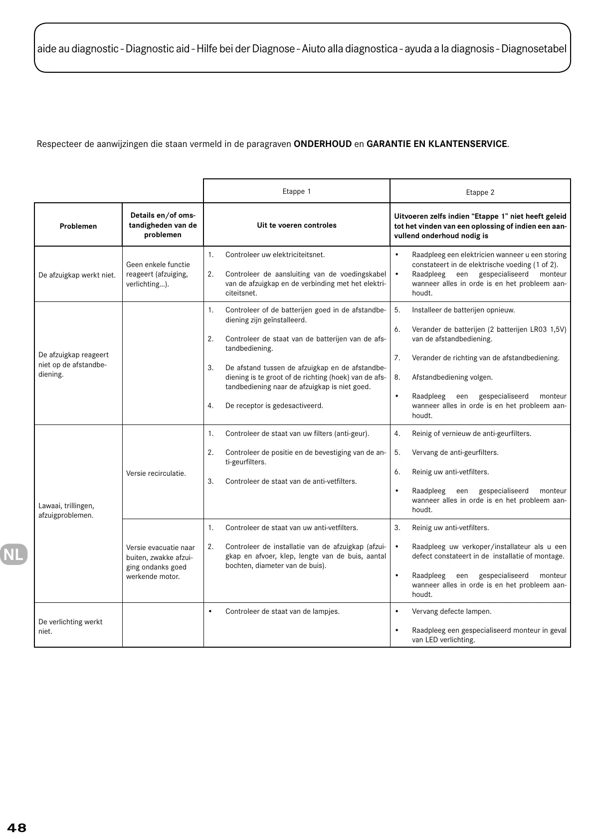 Respecteer de aanwijzingen die staan vermeld in de paragraven ONDERHOUD en GARANTIE EN KLANTENSERVICE.
