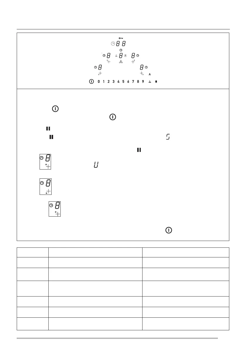- Houd de toets ingedrukt en druk op de 4 toetsen Digit van de kookzones ( ), één voor één, rechtsom en