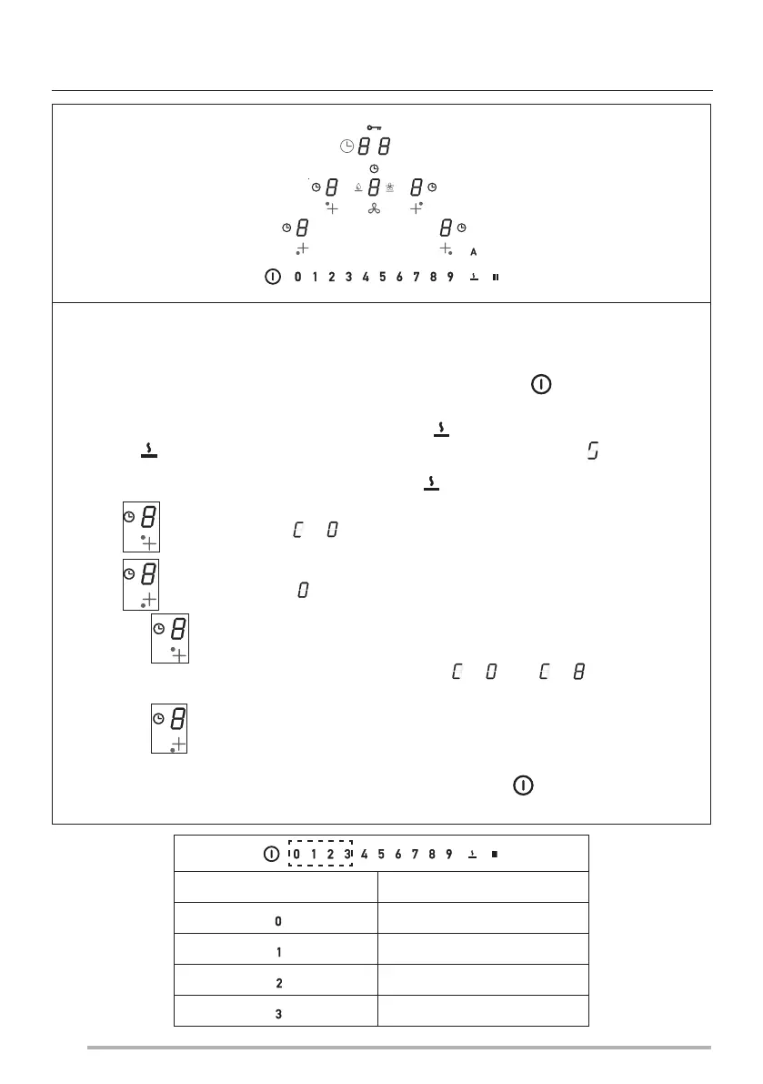 Houd de toets ingedrukt en druk één voor één linksom op de 4 Digits van de kookzones ( ), beginnend aan