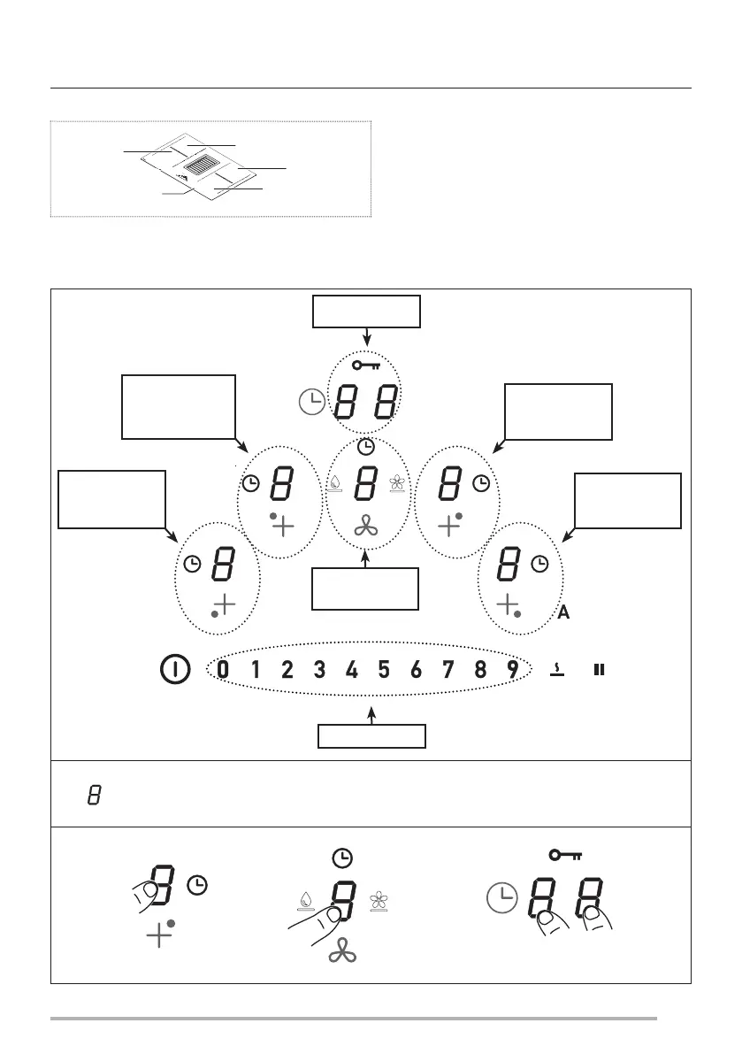 The controls for the cooking areas, suction hood and timer can be activated by pressing on the reference