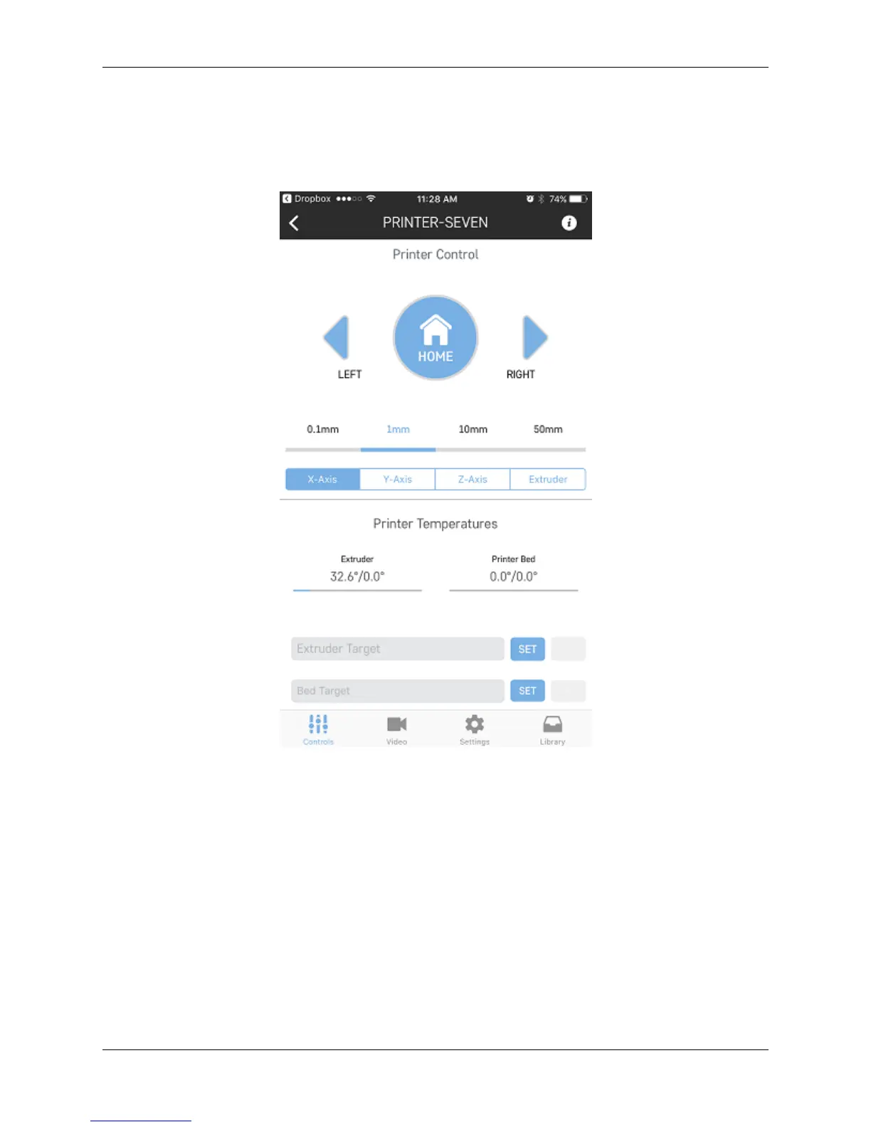 Here you can move motors, heat up your nozzle, as well as view your terminal, which will show you what commands
