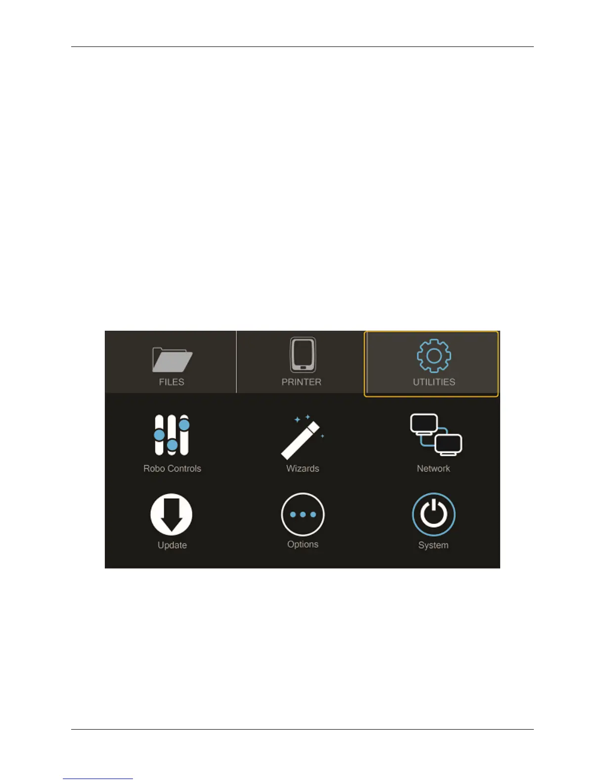 Utilities -The Utilities menu offers a variety of options including: motor control, temperature control, z-offset wizard,