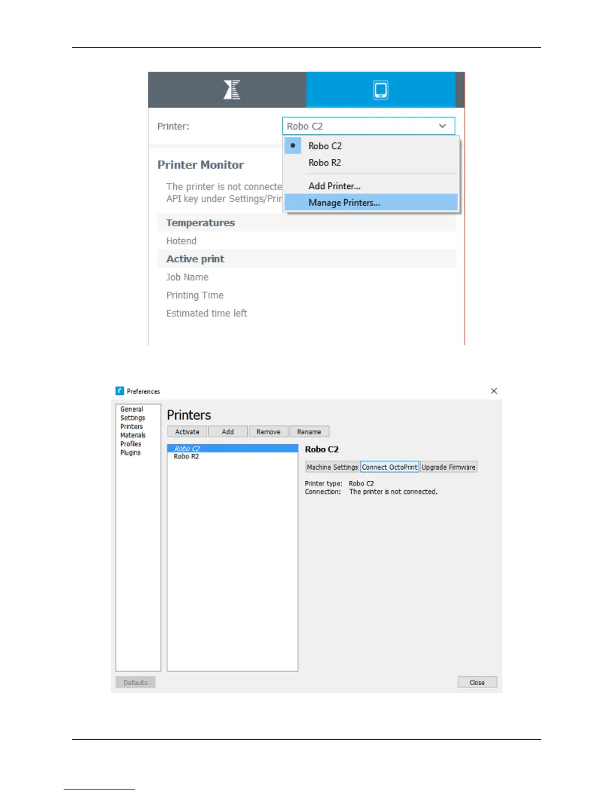 4. A new window labeled ‘Connect Octoprint’ will pop up. In the top middle of this window, click on the button