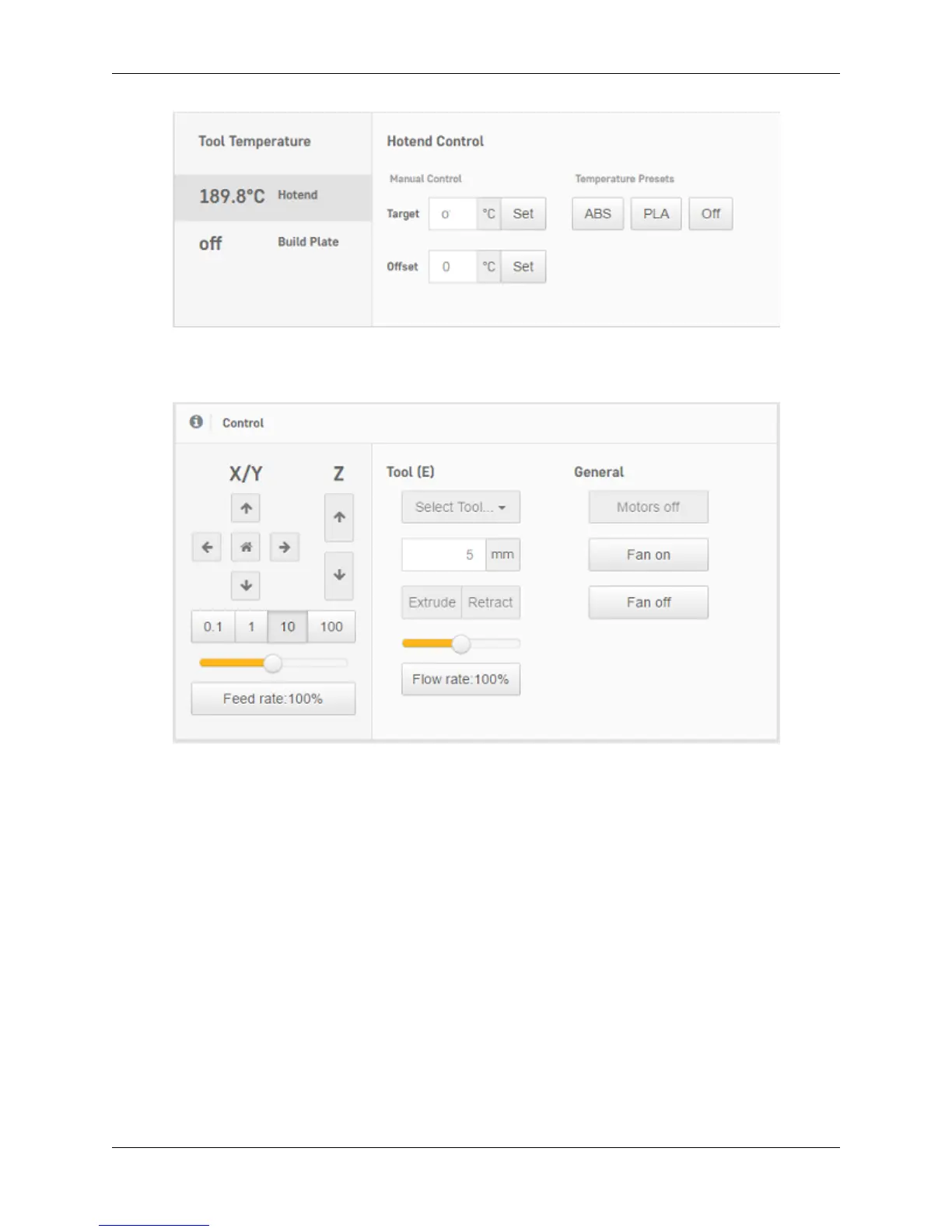 2. Under the ‘Control’ section of the interface, you can move your motors and extrude filament. Use the arrows