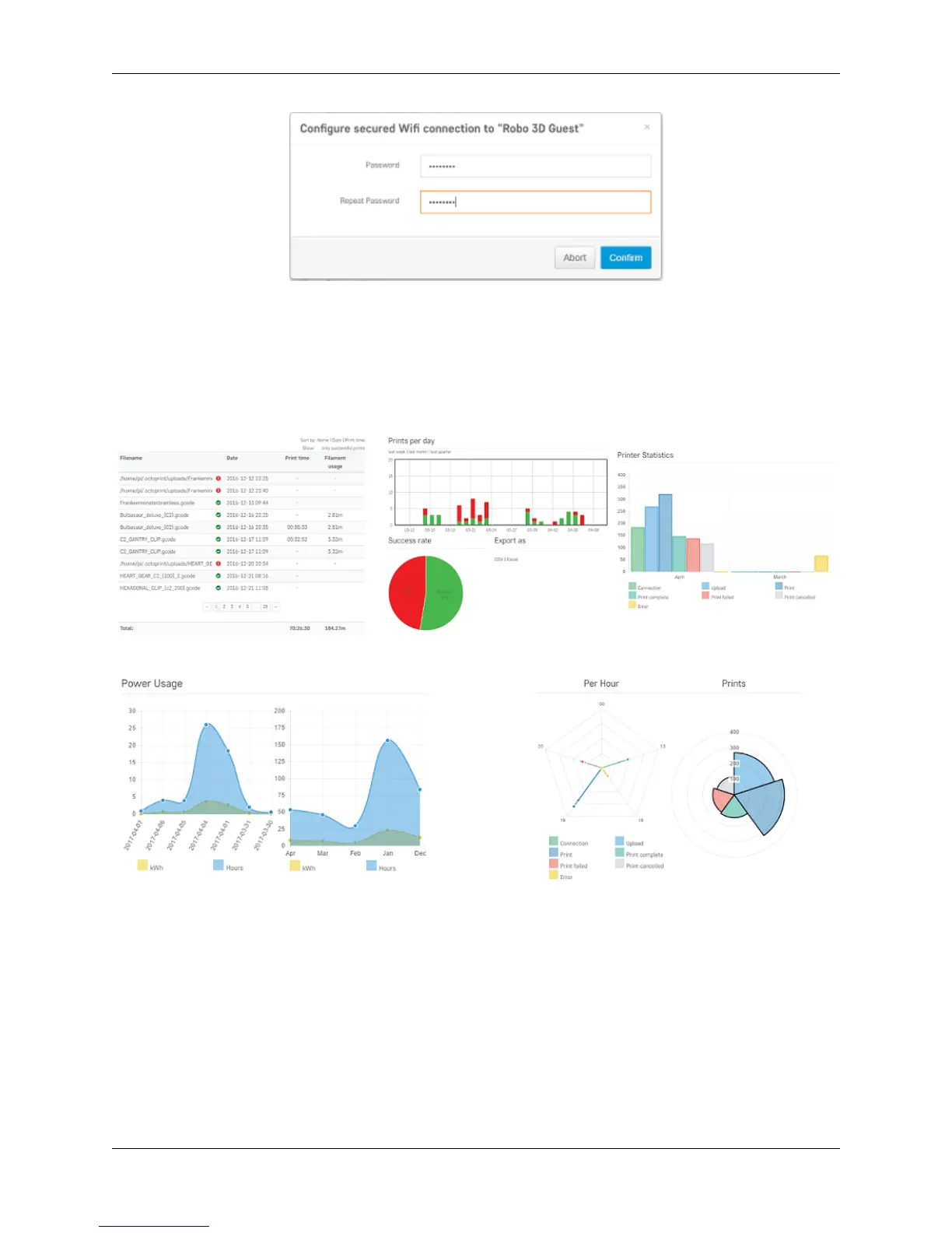 things you can get info on are; history, prints per day and success rate, printer statistics, and power usage. This is a