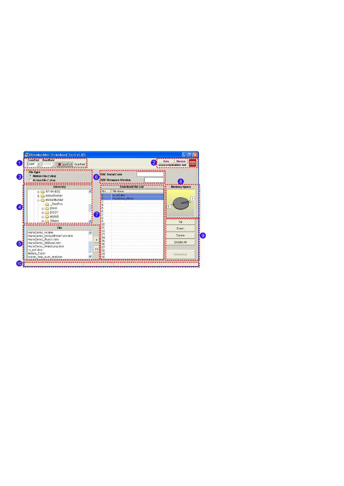 Download Tool is used for downloading a number of Motion files (*.rbm) or Action files (*.rba)