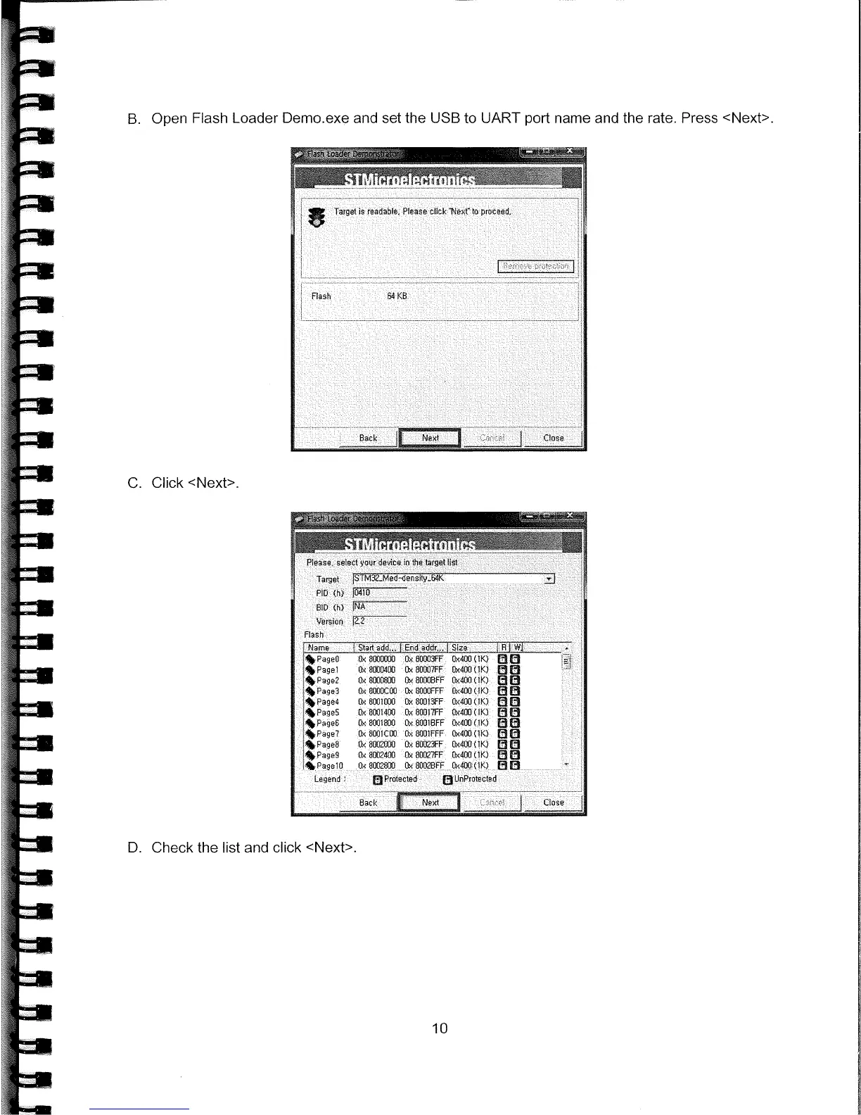 Open Flash Loader Demo.exe and set the USB to UART port name and the rate. Press <Next>.