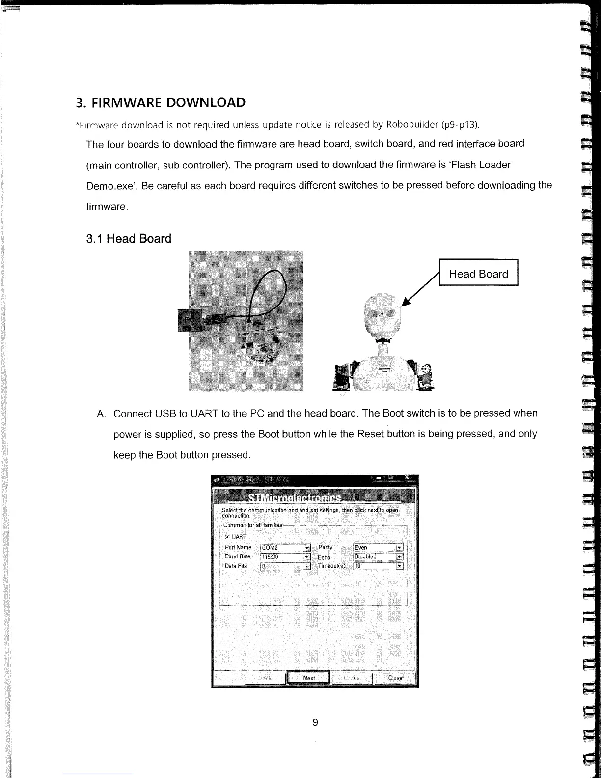 A. Connect USB to UART to the PC and the head board. The Boot switch is to be pressed when