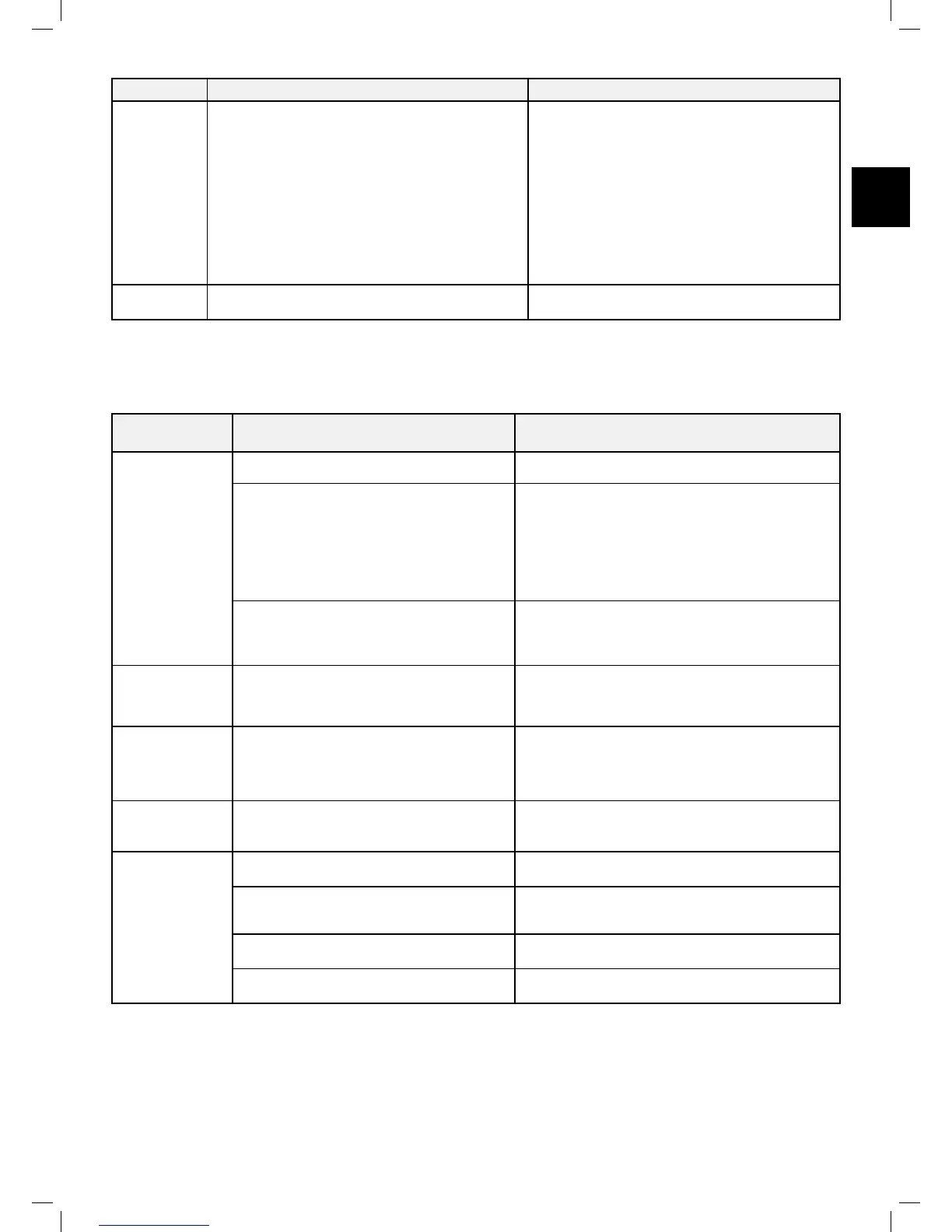 The next table will give details and possible causes of other faults, which do not provide error codes. If a fault