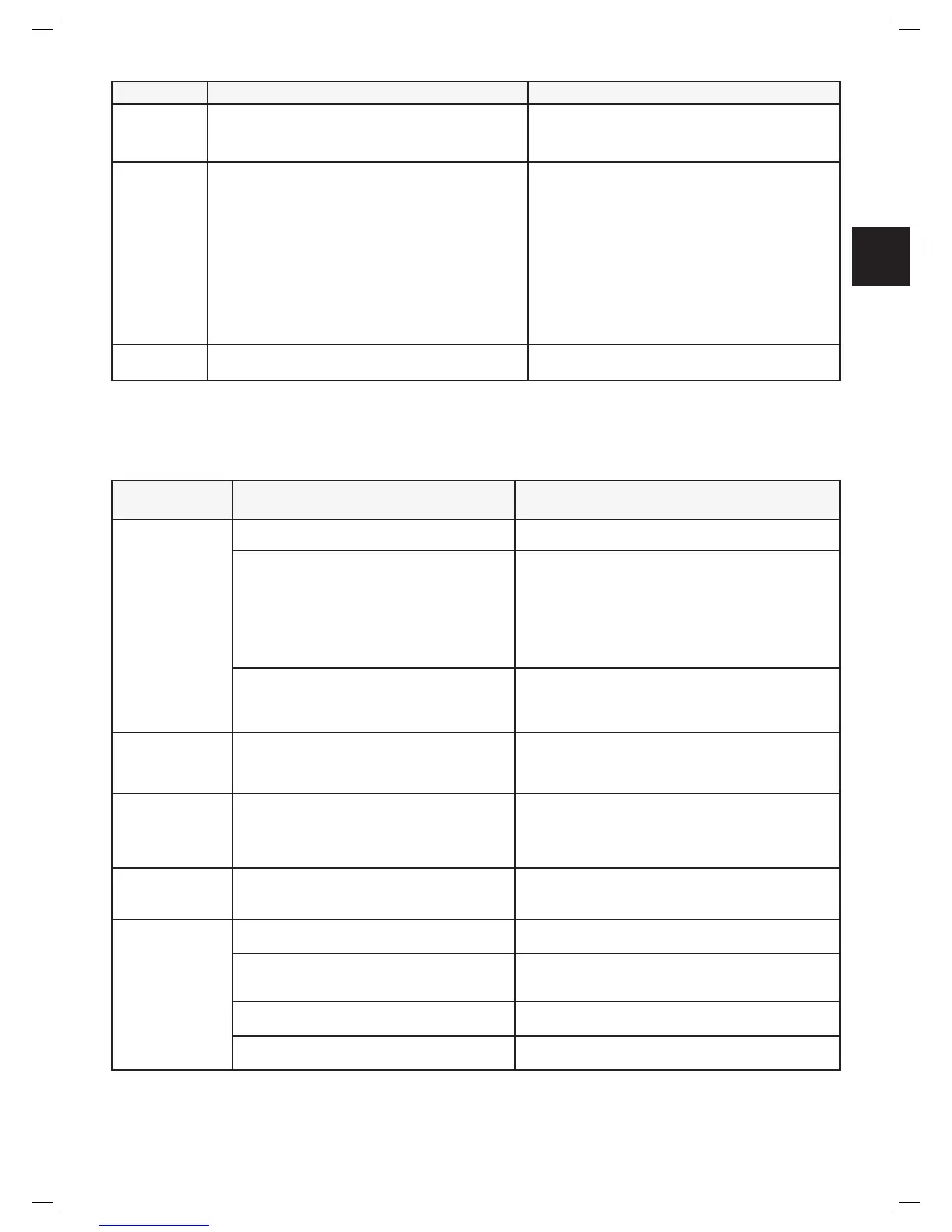 The next table will give details and possible causes of other faults, which do not provide error codes. If a fault