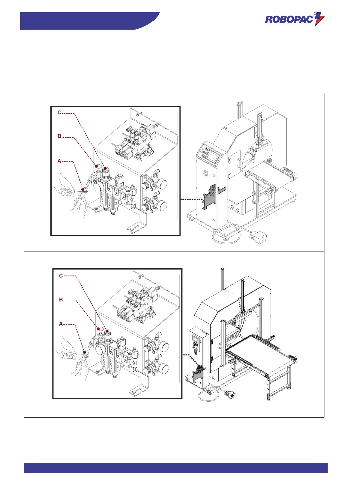 Check that the pressure gauge indicates at least 6 bar and use the knob (C) to compensate any pressure
