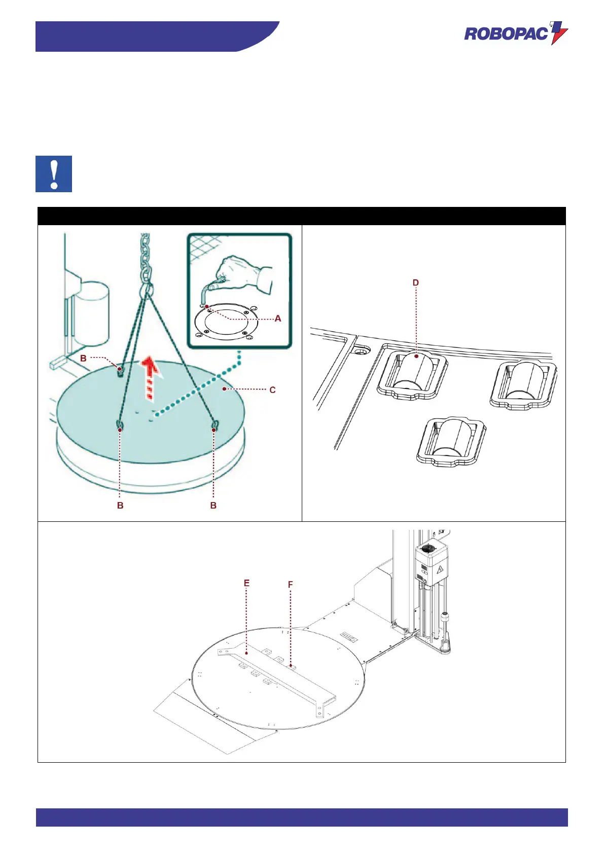 2. Fit the eyebolts (B) on the rotary table (C).