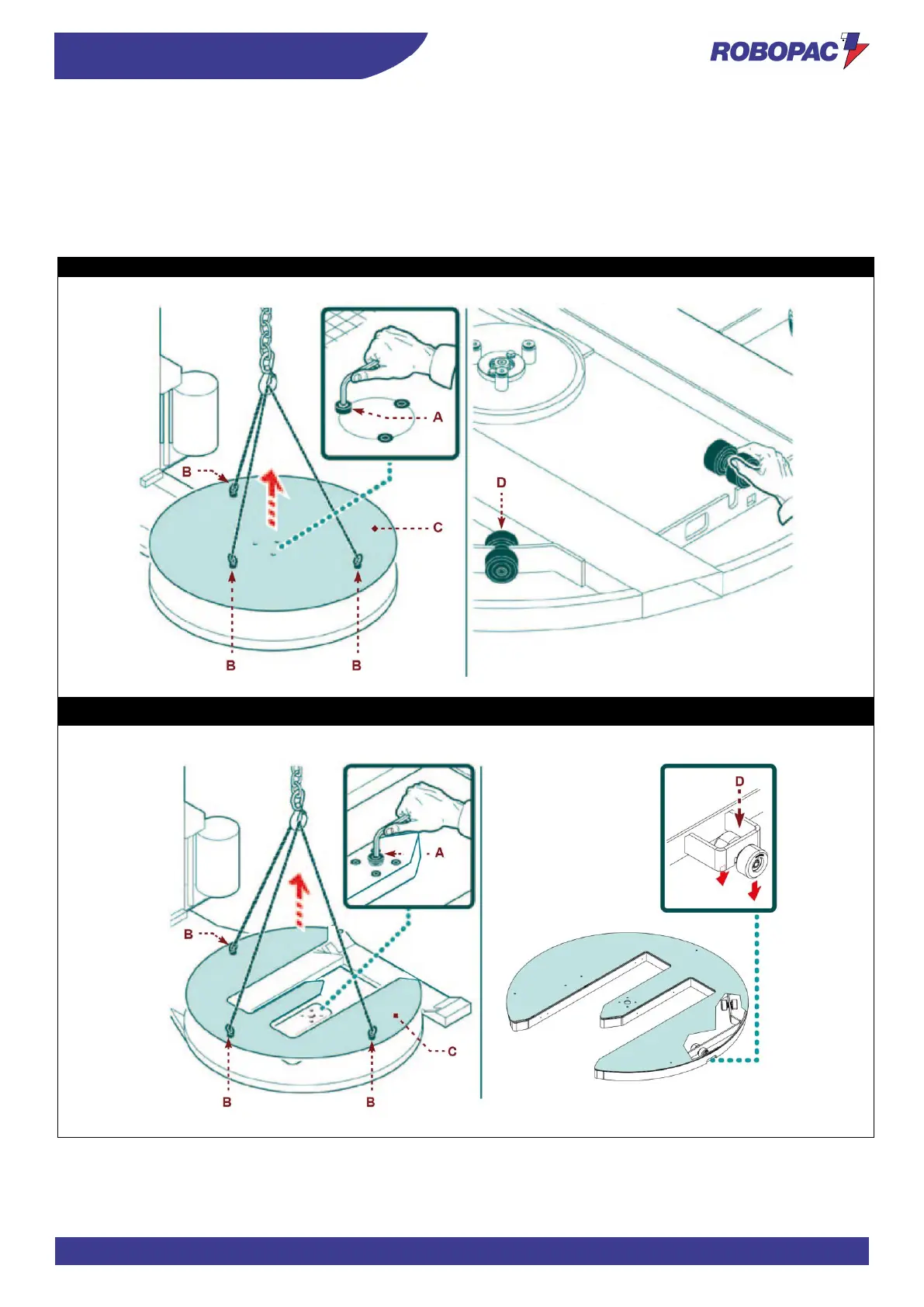 2. Fit the eyebolts (B) and remove the upper plate (C).