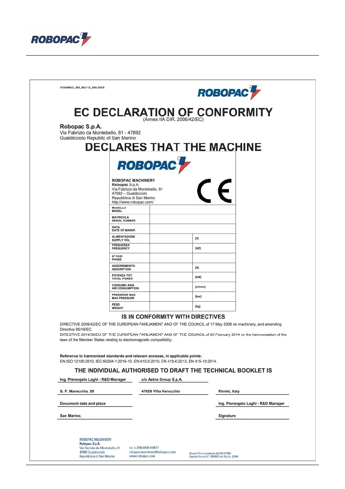 Robopac PACK 5040M - Ce Statement of Conformity