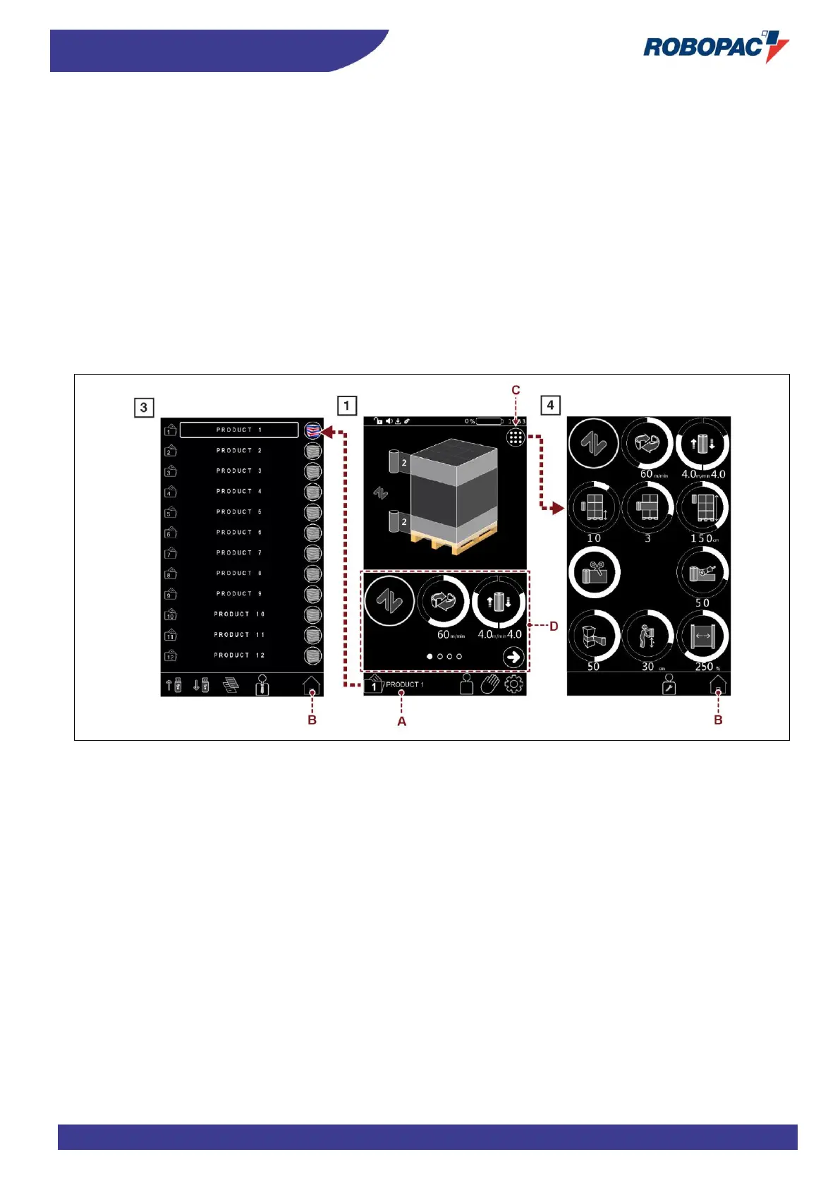 6. Press the button (C) to display the “wrapping cycle” page 4 or select in zone (D) the parameters to be set.