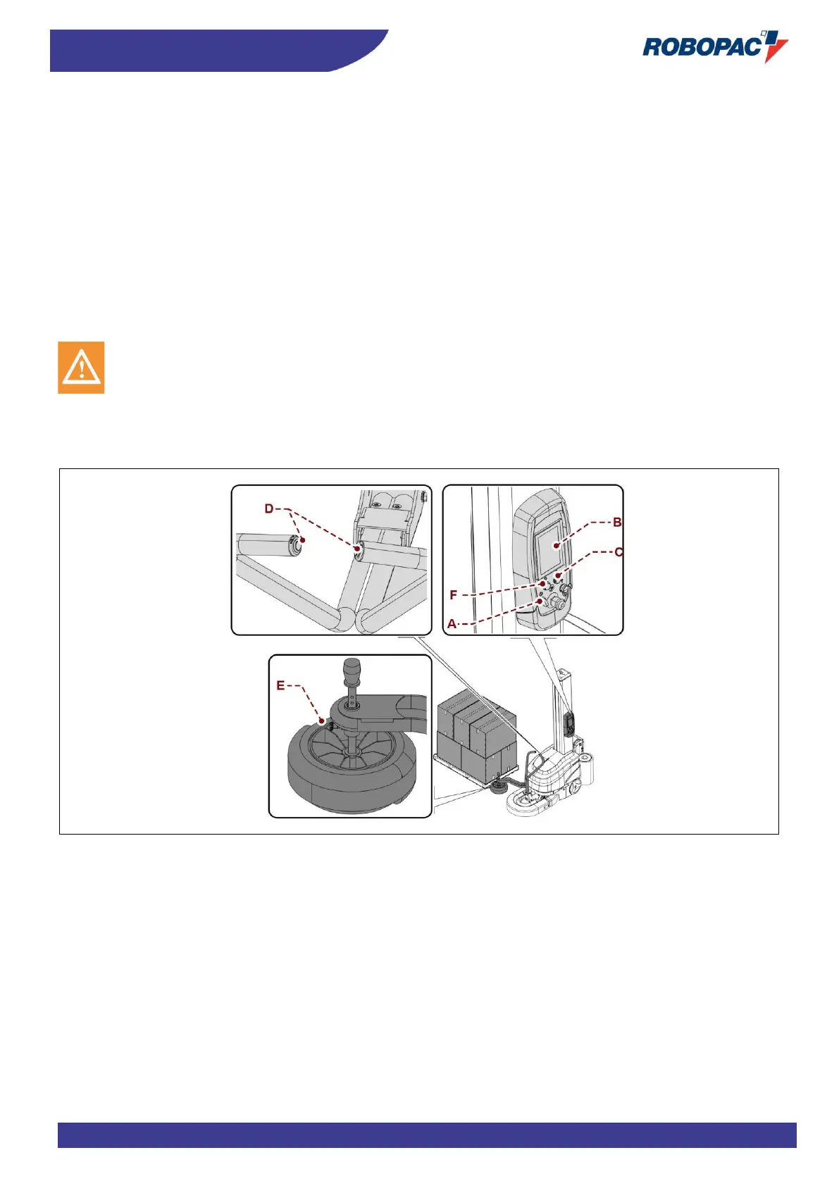 3. Use the buttons (D) to move the machine closer to the pallet, until the feeler wheel (E) leans against the pallet.