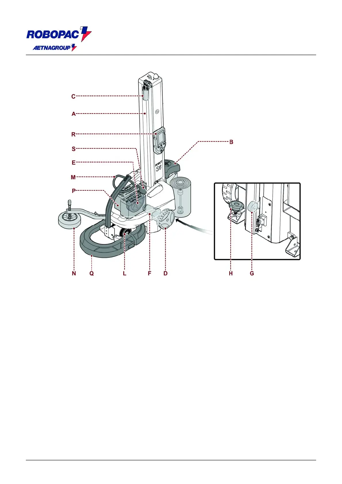 N) Feeler wheel: Its purpose is to follow the perimeter of the pallet during the wrapping cycle.