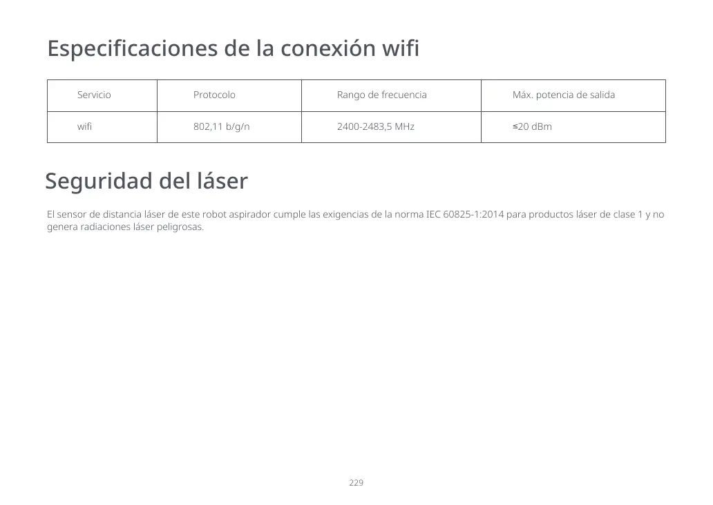 Especificaciones de la conexión wifi