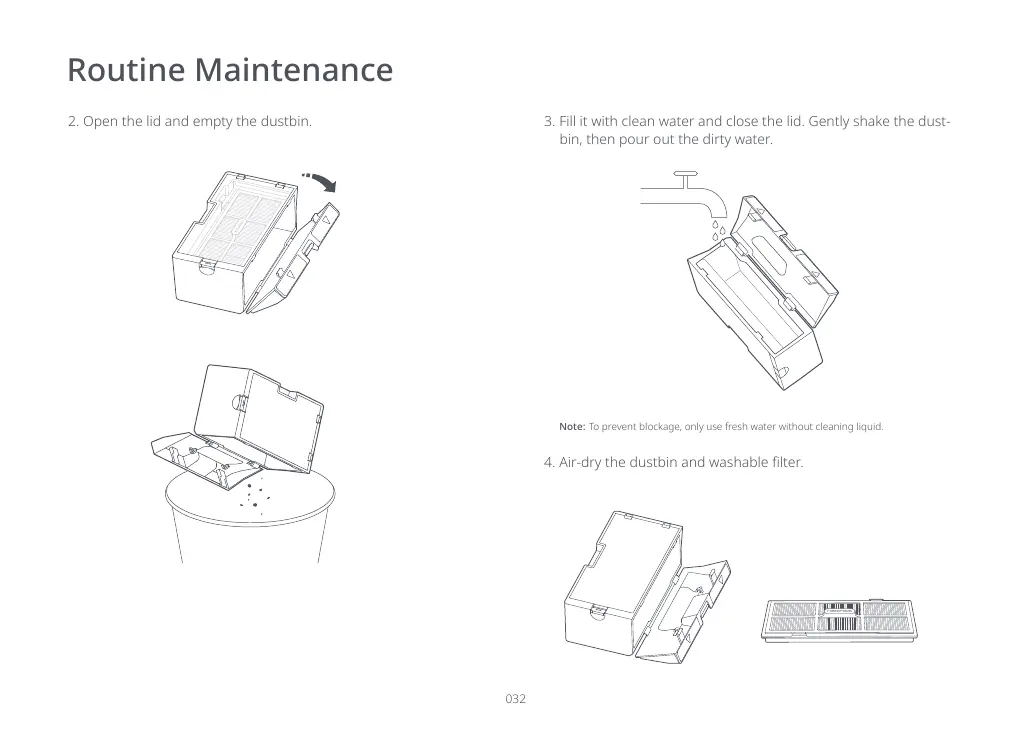 2SHQWKHOLGDQGHPSW\WKHGXVWELQ )LOOLWZLWKFOHDQZDWHUDQGFORVHWKHOLG*HQWO\VKDNHWKHGXVW