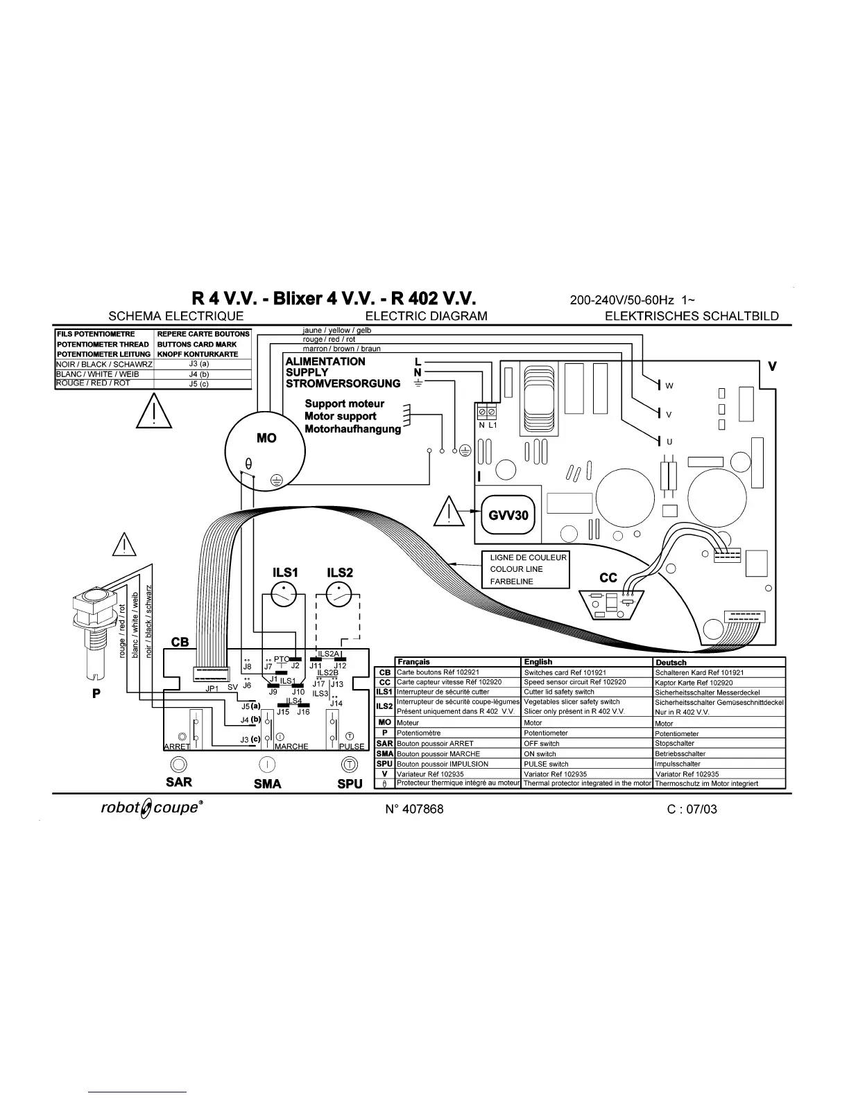 Robot Coupe Blixer 4 - Blixer 4 V.V.; R402 V.V. Electrical Diagram; Potentiometer and Speed Control Wiring