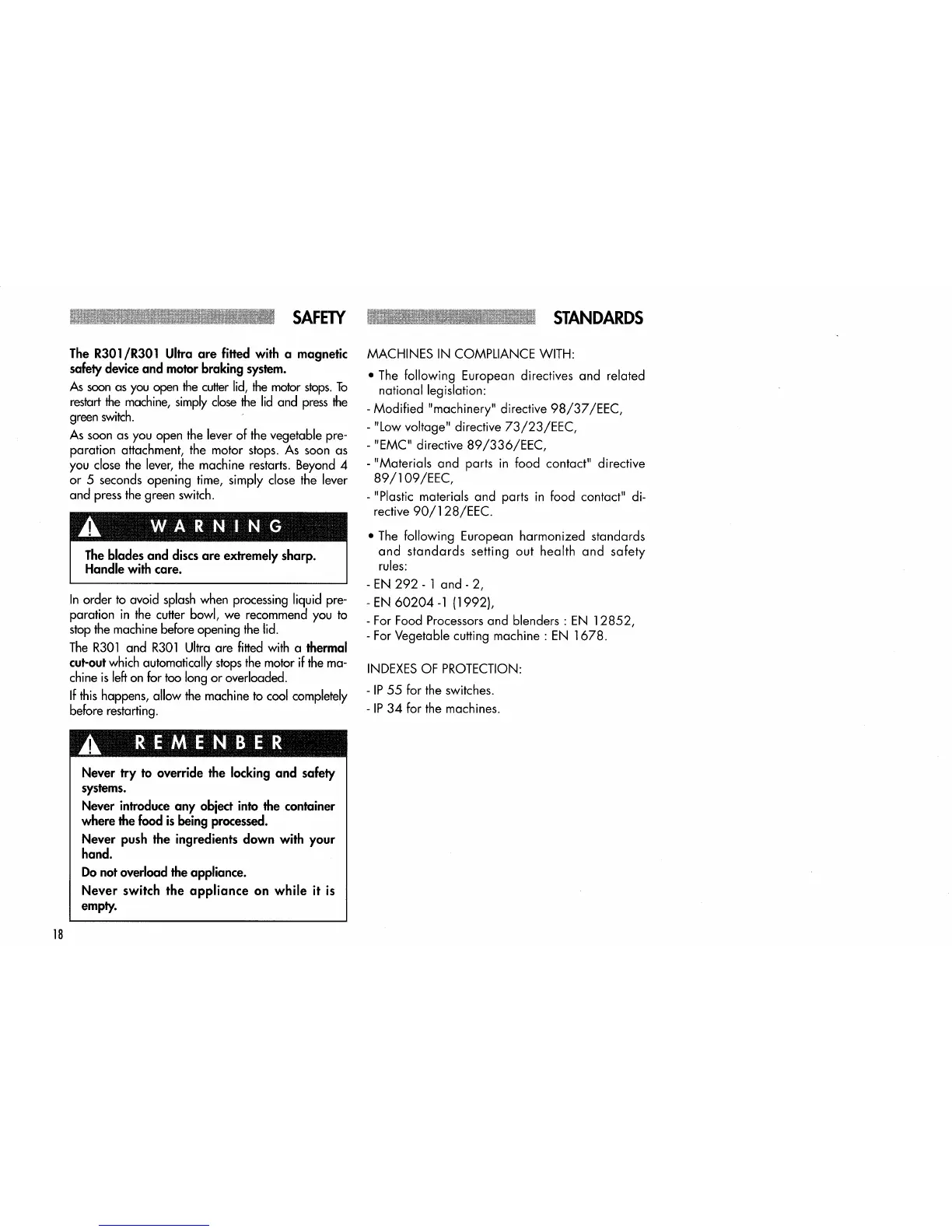 Robot Coupe R301 - Safety Features and Standards Compliance; Safety Devices; Operating Reminders
