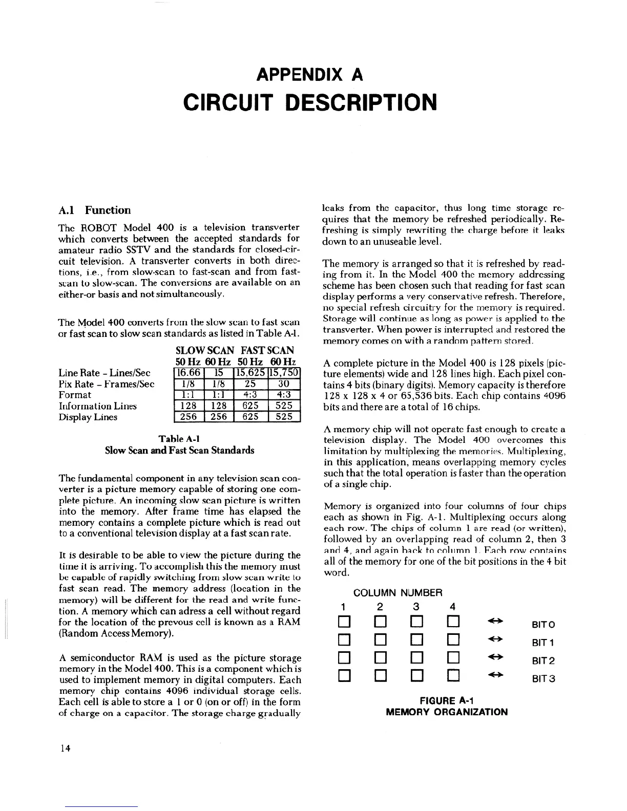 Robot 400 - Circuit Description; Function; Slow Scan and Fast Scan Standards; Memory Organization