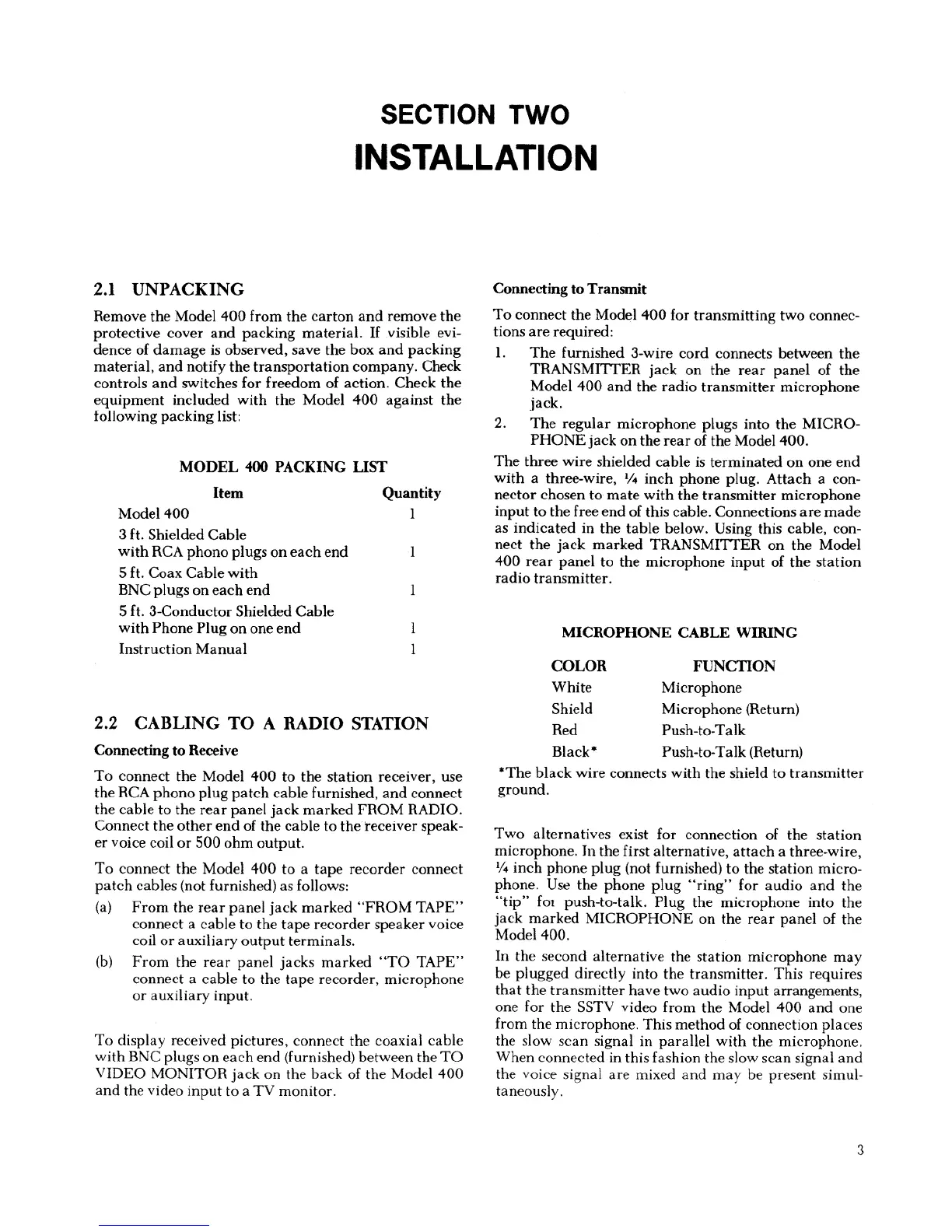 Robot 400 - SECTION TWO INSTALLATION; 2.1 UNPACKING; 2.2 CABLING TO A RADIO STATION