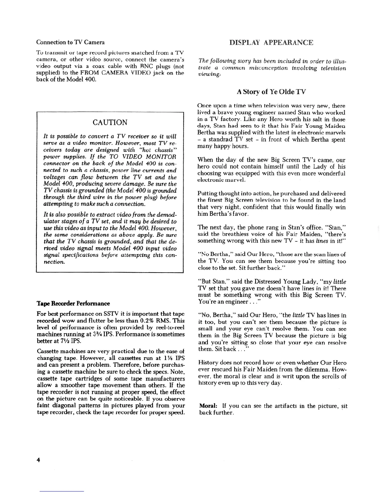 Robot 400 - Display Appearance; Connection to TV Camera; A Story of Ye Olde TV; Tape Recorder Performance