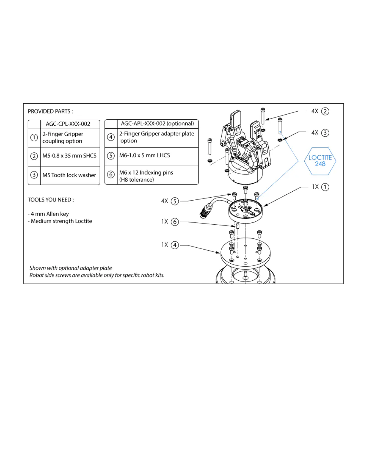 Here are the steps to follow to mount the Gripper to your robot (exploded view in Figure 3.4.3 below). Note that all screws must be locked in place using