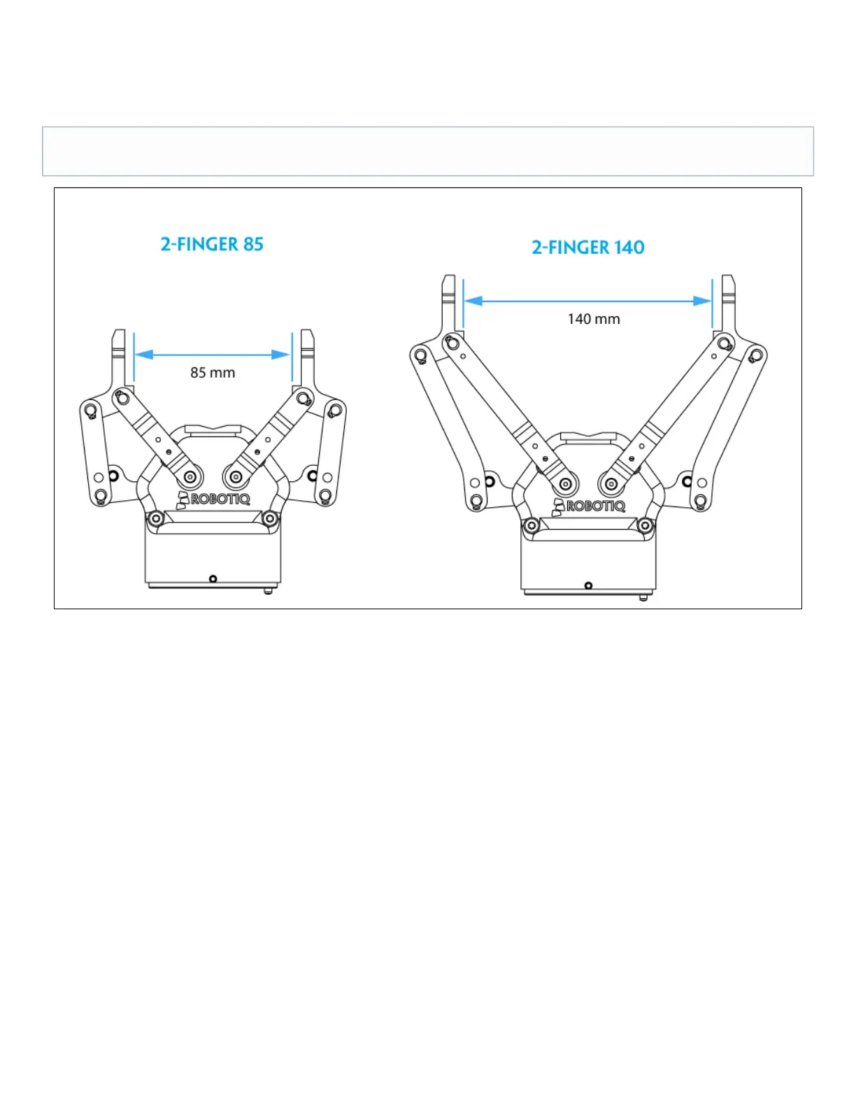 The 2-Finger Gripper comes with either 85 mm opening (2-Finger 85) or 140 mm opening (2-Finger 140) according to Figure 1.2. the Gripper chassis will