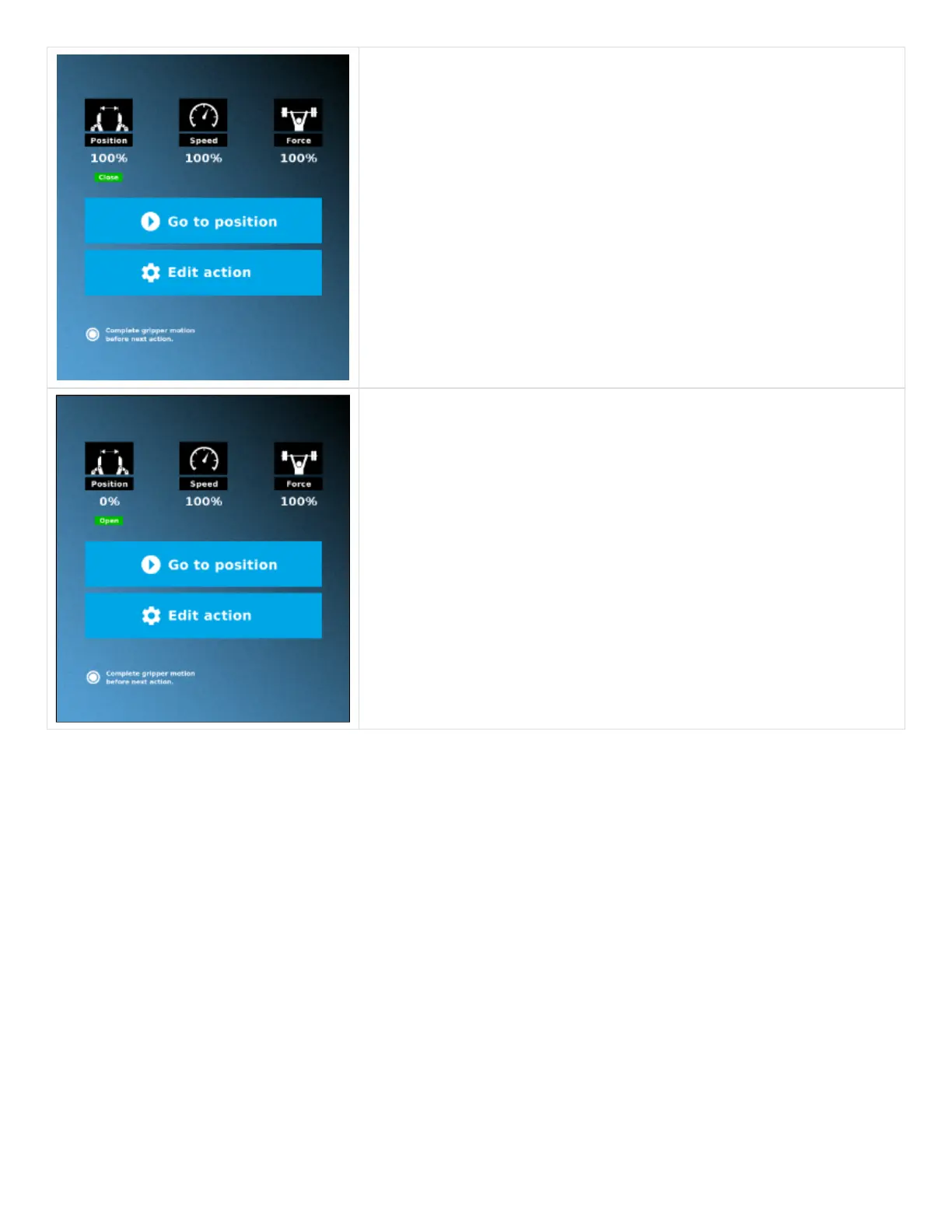 When the Gripper action is to open, a green "Open" icon appears.