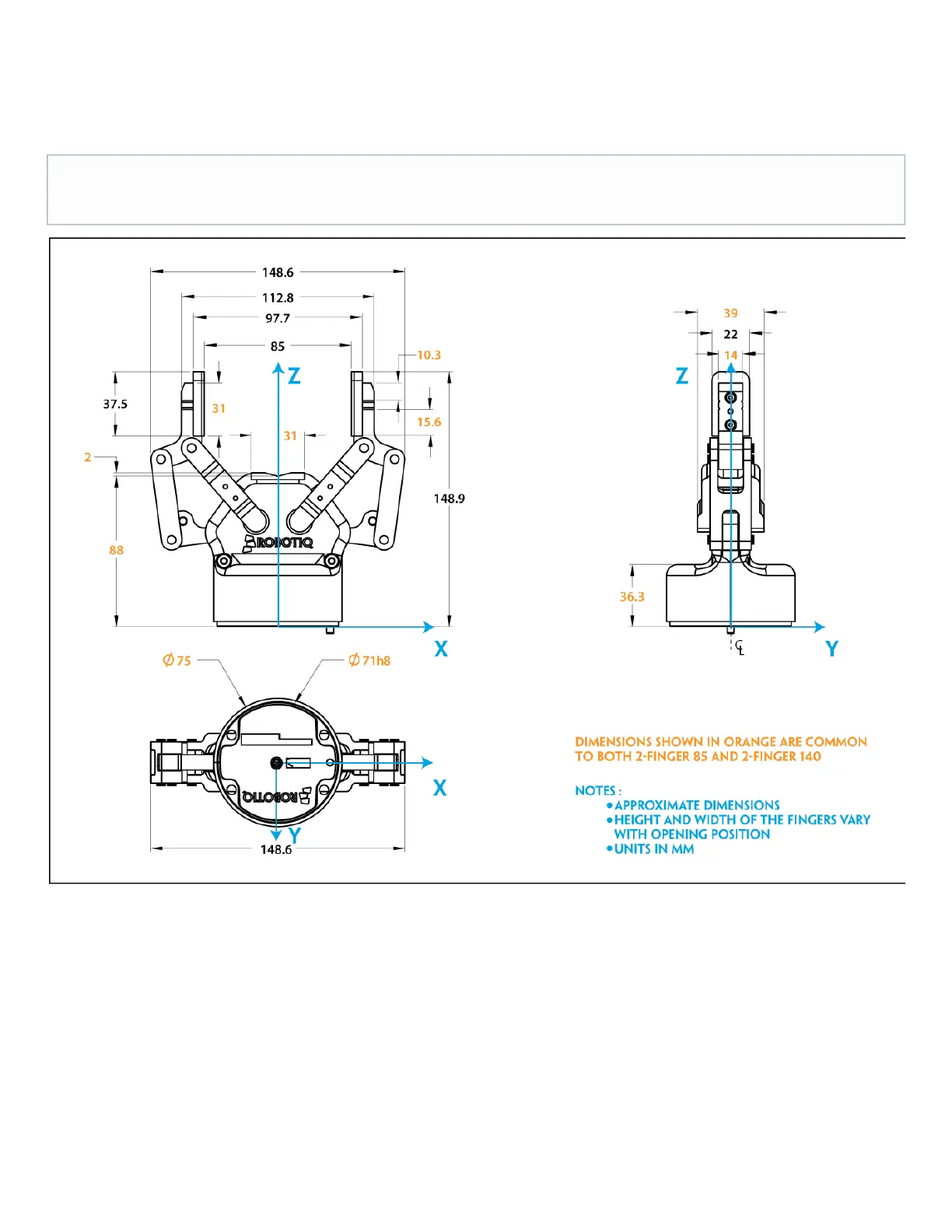 The 2-Finger 85 and 2-Finger 140 share the same basic chassis and thus have the same technical dimensions for everything except the fingers. Figure
