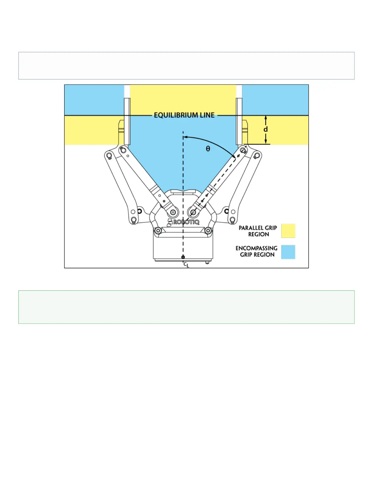Figure 1.5 shows the encompassing grip region, the equilibrium line, and the parallel grip region on the 2-Finger Adaptive Robot Gripper.
