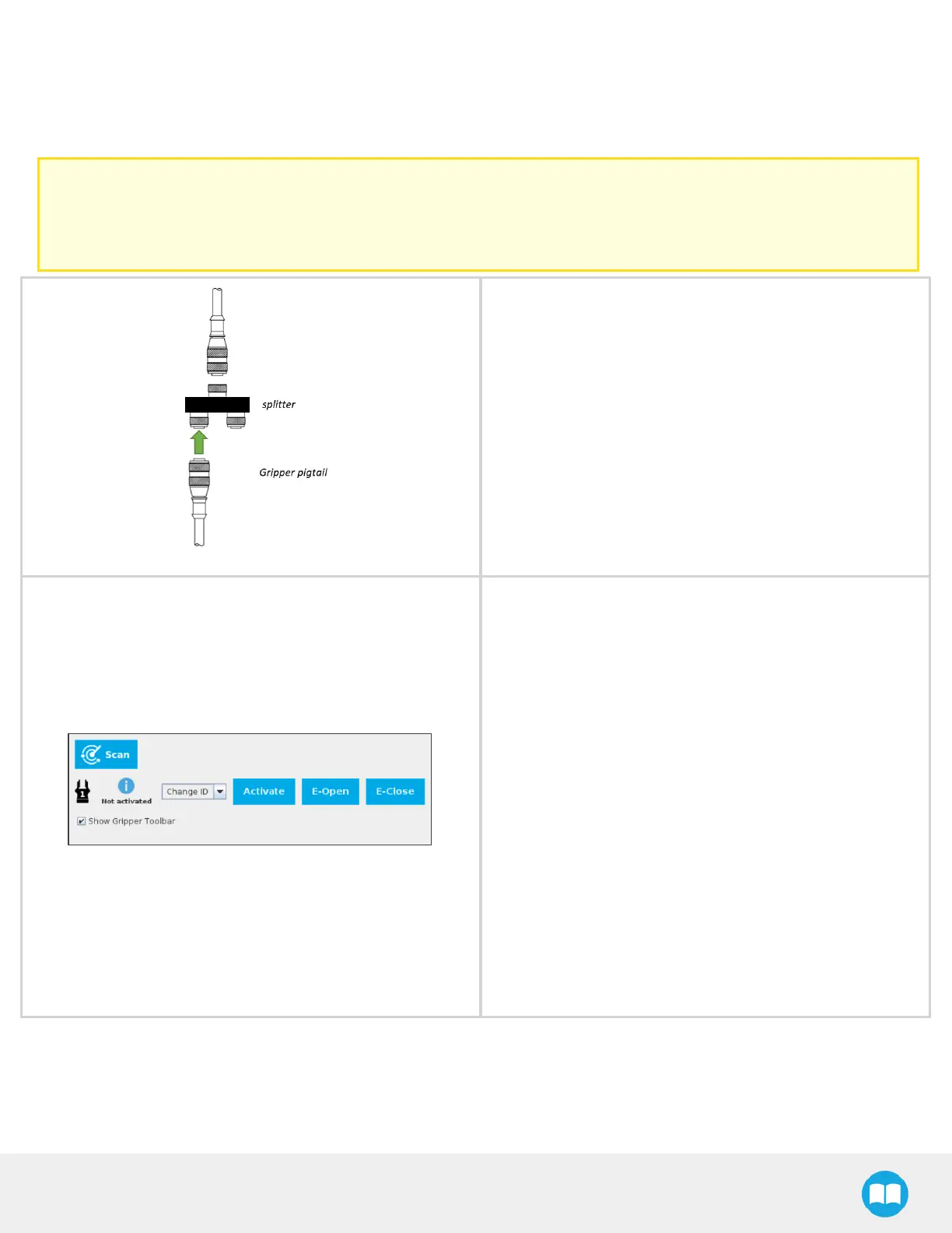 Connect only one gripper at a time using the splitter (refer to the Installing the Gripperon the robot section and the