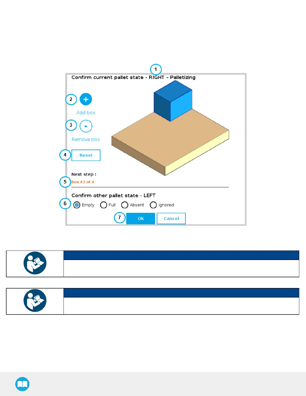 6. The Confirm other pallet state section prompts the user to select the state of the other pallet (LEFT if the current pallet is the