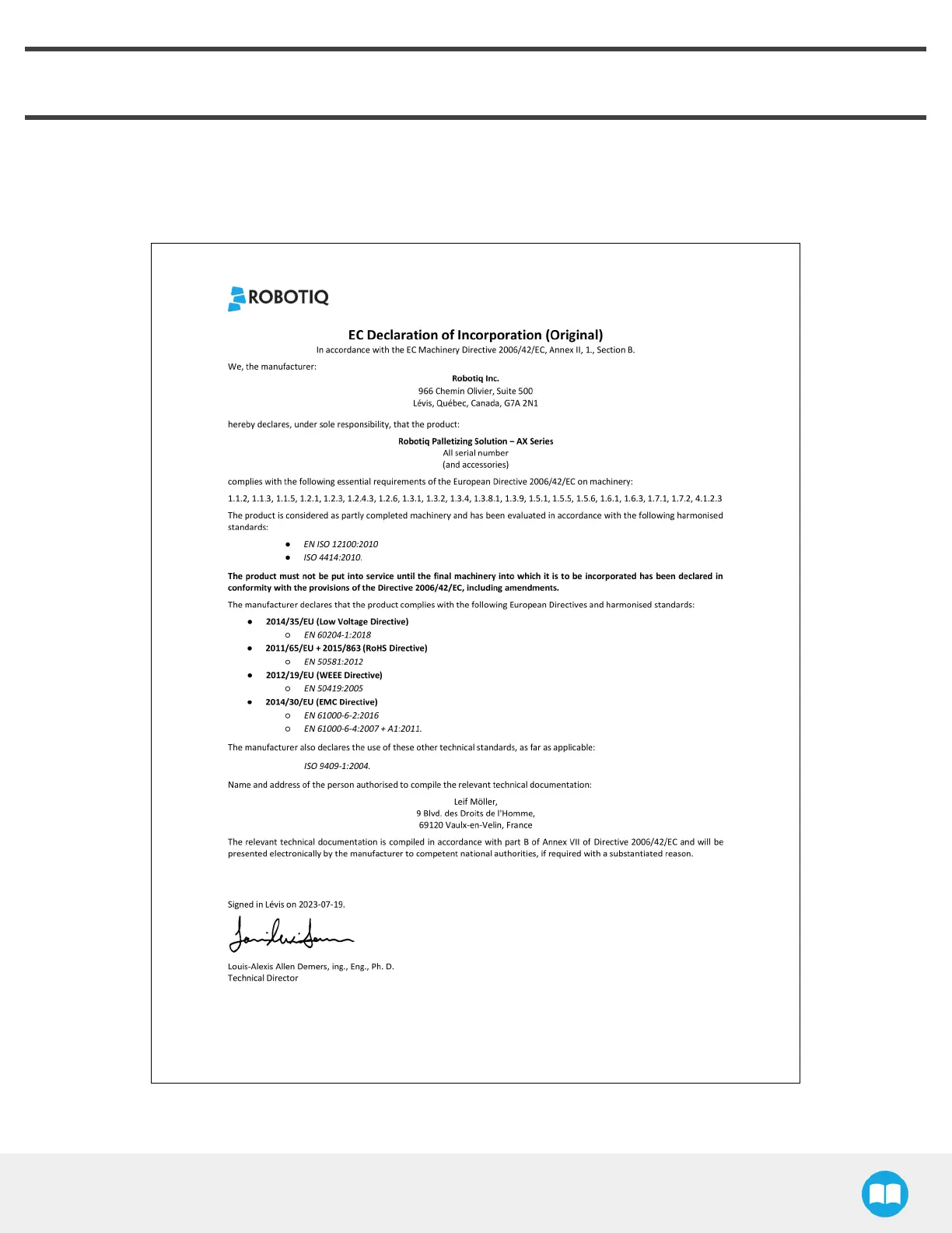 ROBOTIQ AX10 - Harmonized Standards; EC Declaration of Incorporation