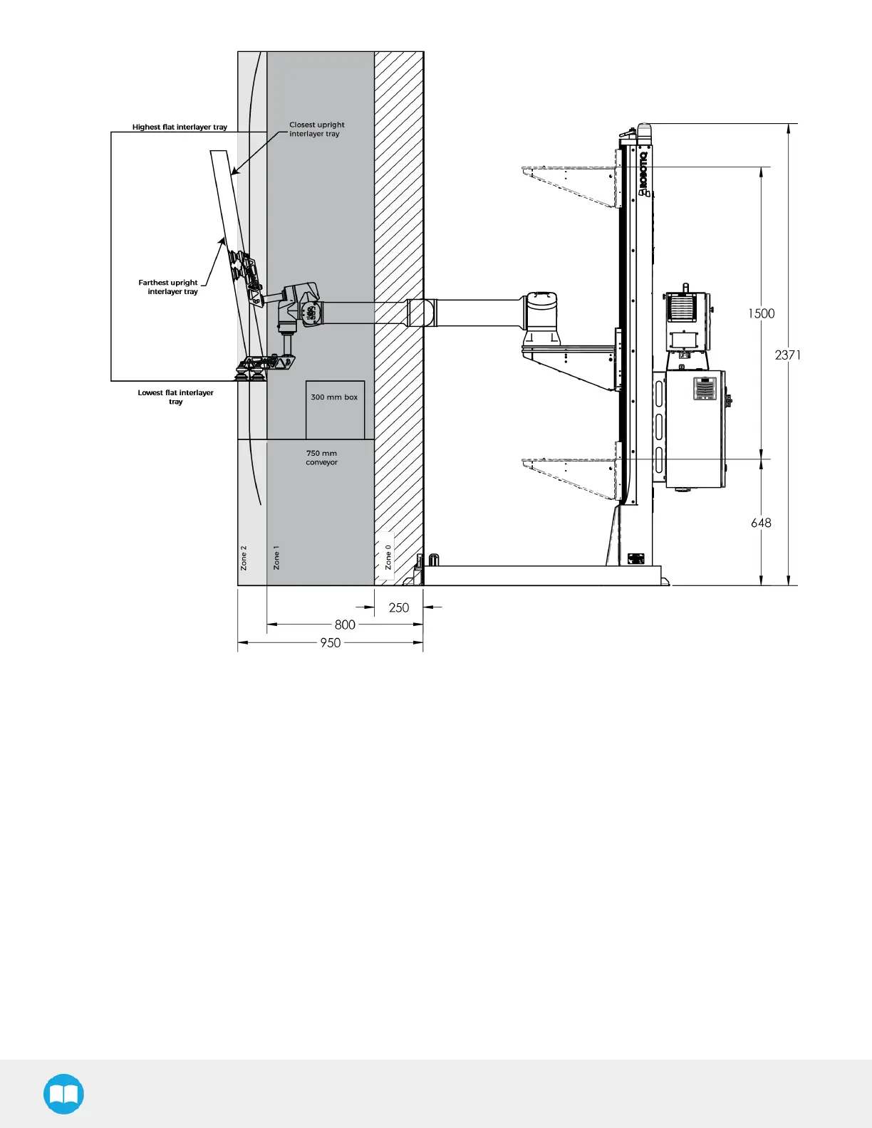 The figure above is a side view of the recommended palletizing cell layout and distances, with the handling of 300 mm square