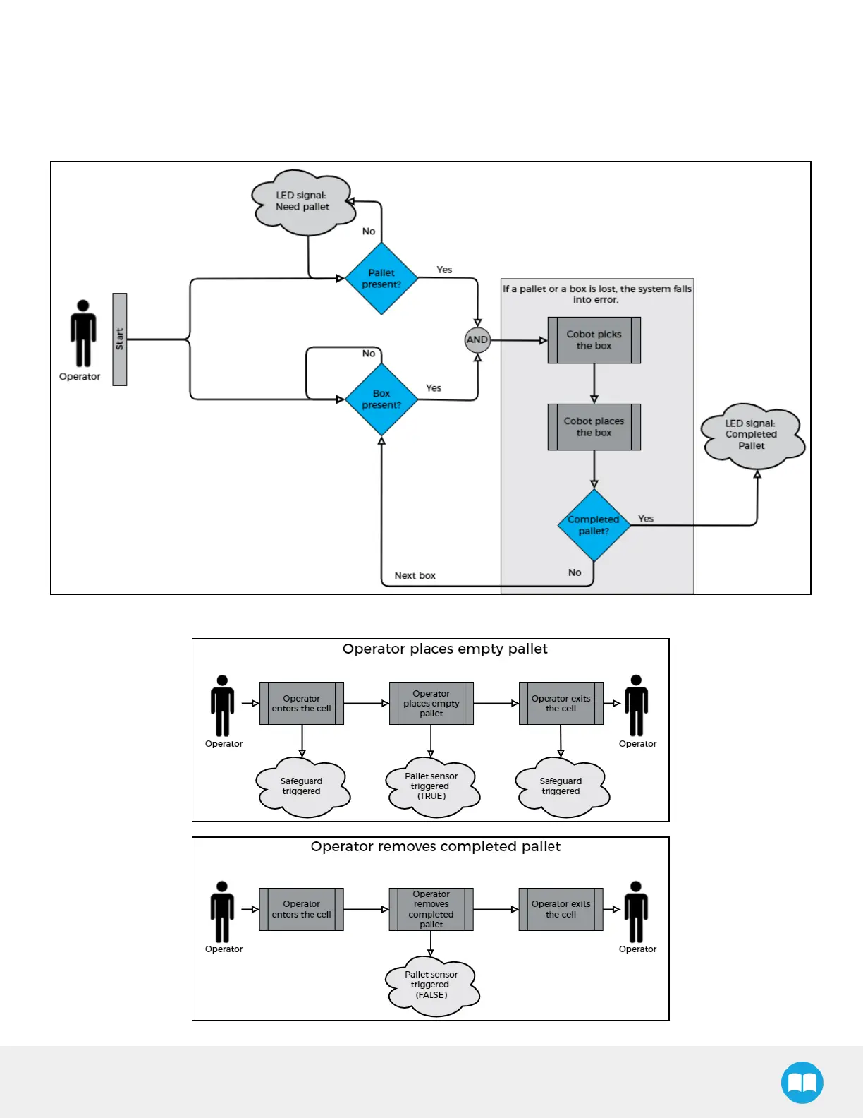 The following diagrams explain the logic of the Palletizing Solution process based on the operator's actions, as well as responses
