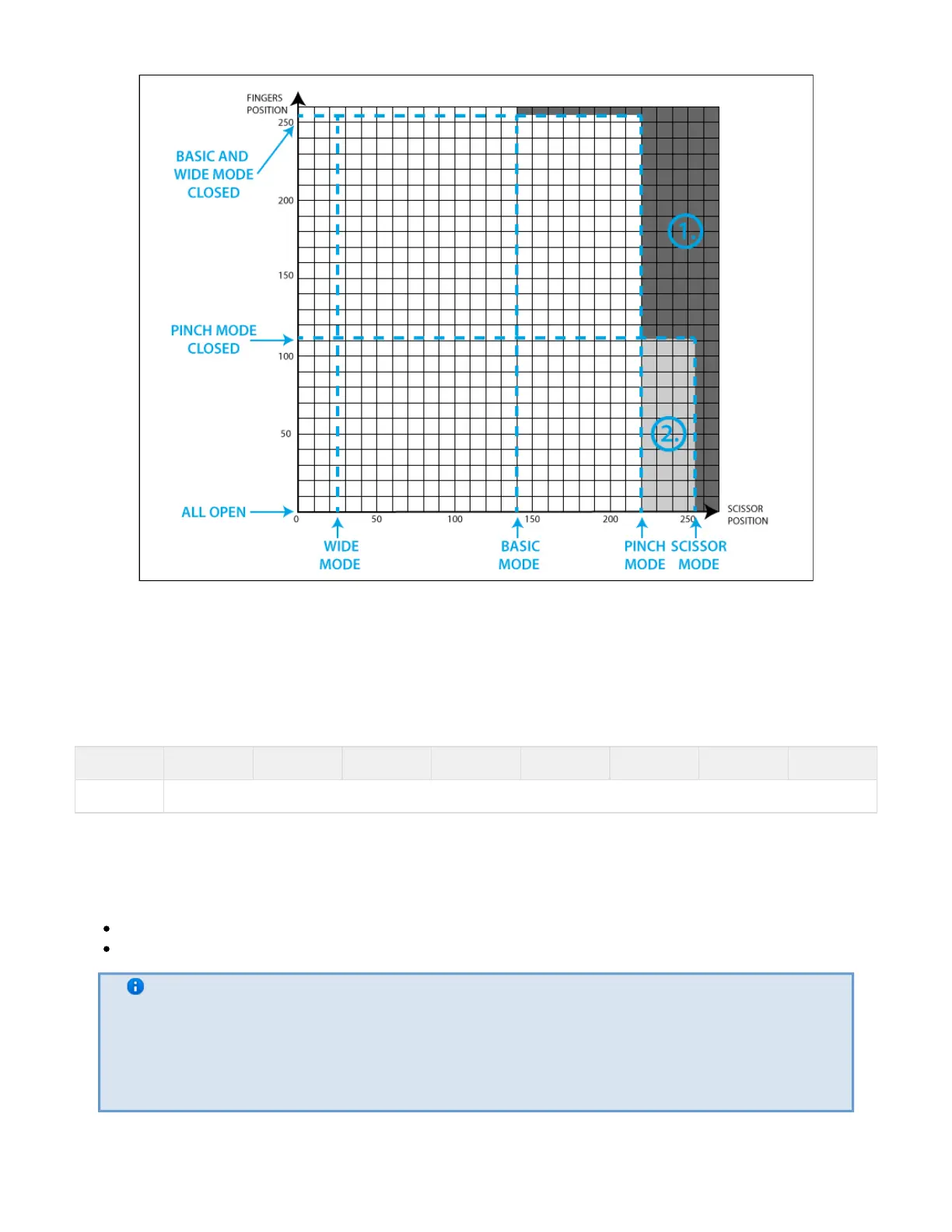 Figure 4.4.1 : Reachable workspace of the fingers and scissor axis, zone 1 is never reachable, zone 2 is only