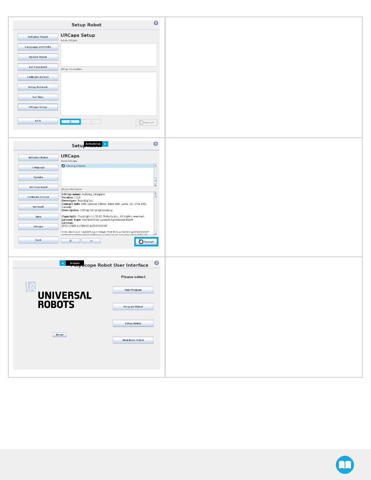 1. When PolyScope reopens, the Gripper Toolbar will appear on