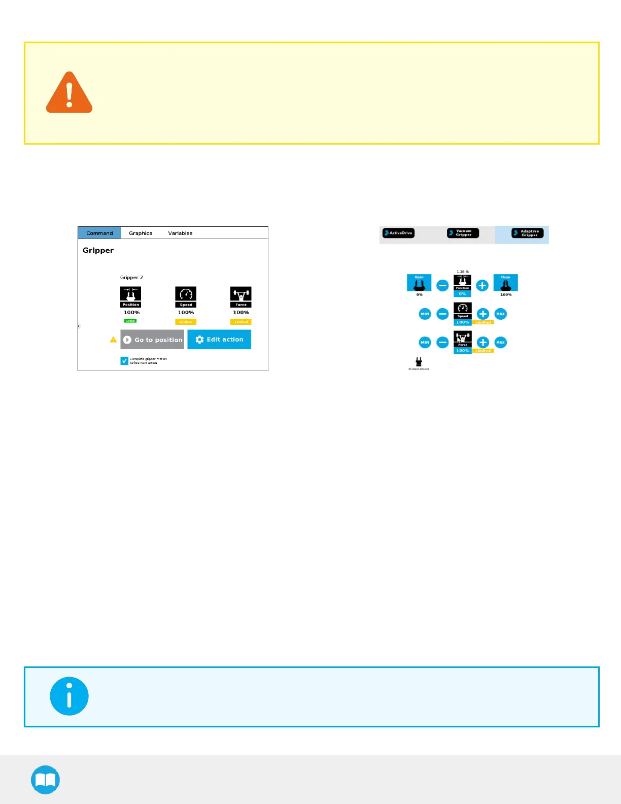 When a limitation is effective, some reminders appear in PolyScope. When adding gripper commands to a program or issuing