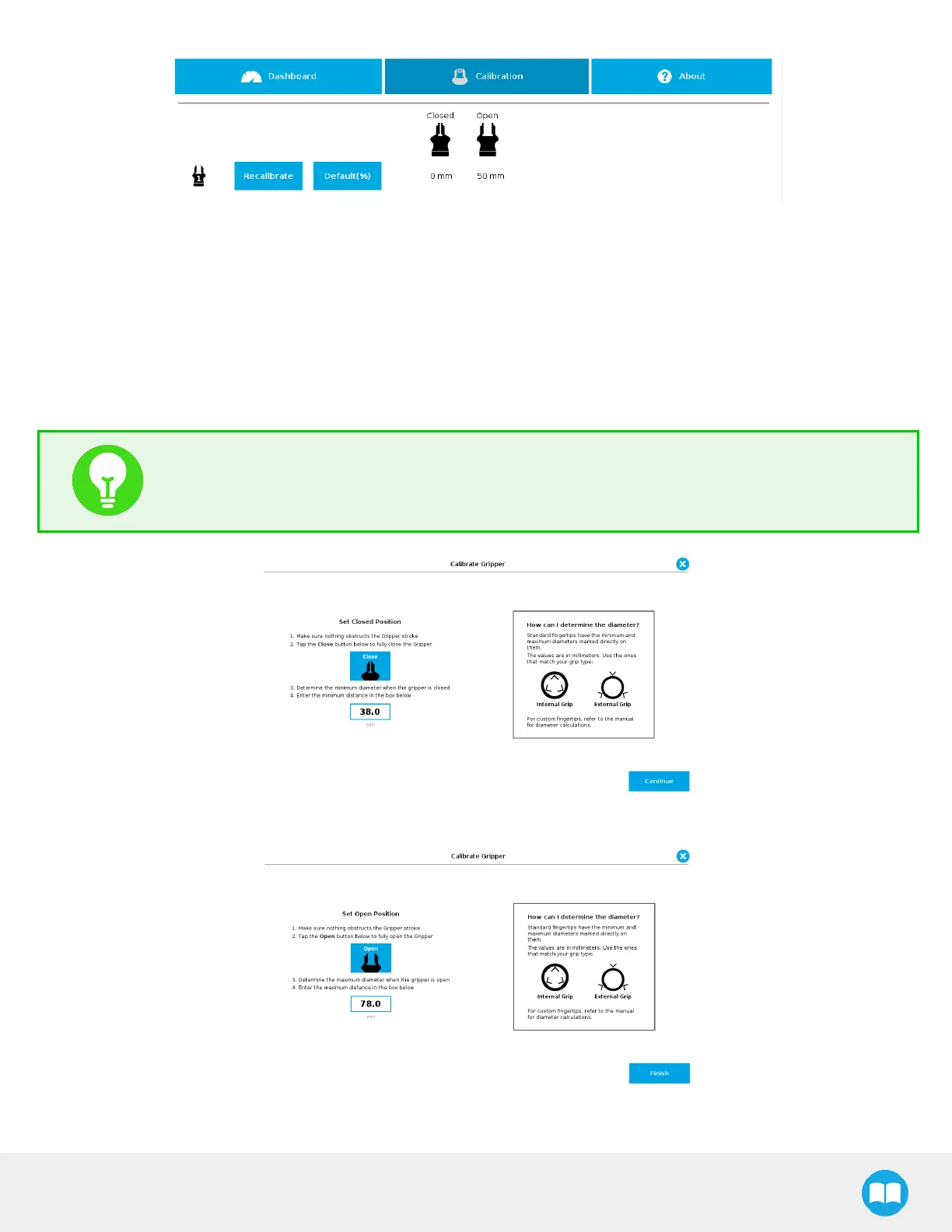 Tapping the Calibrate button in the Gripper Calibration menu launches the Calibration wizard.