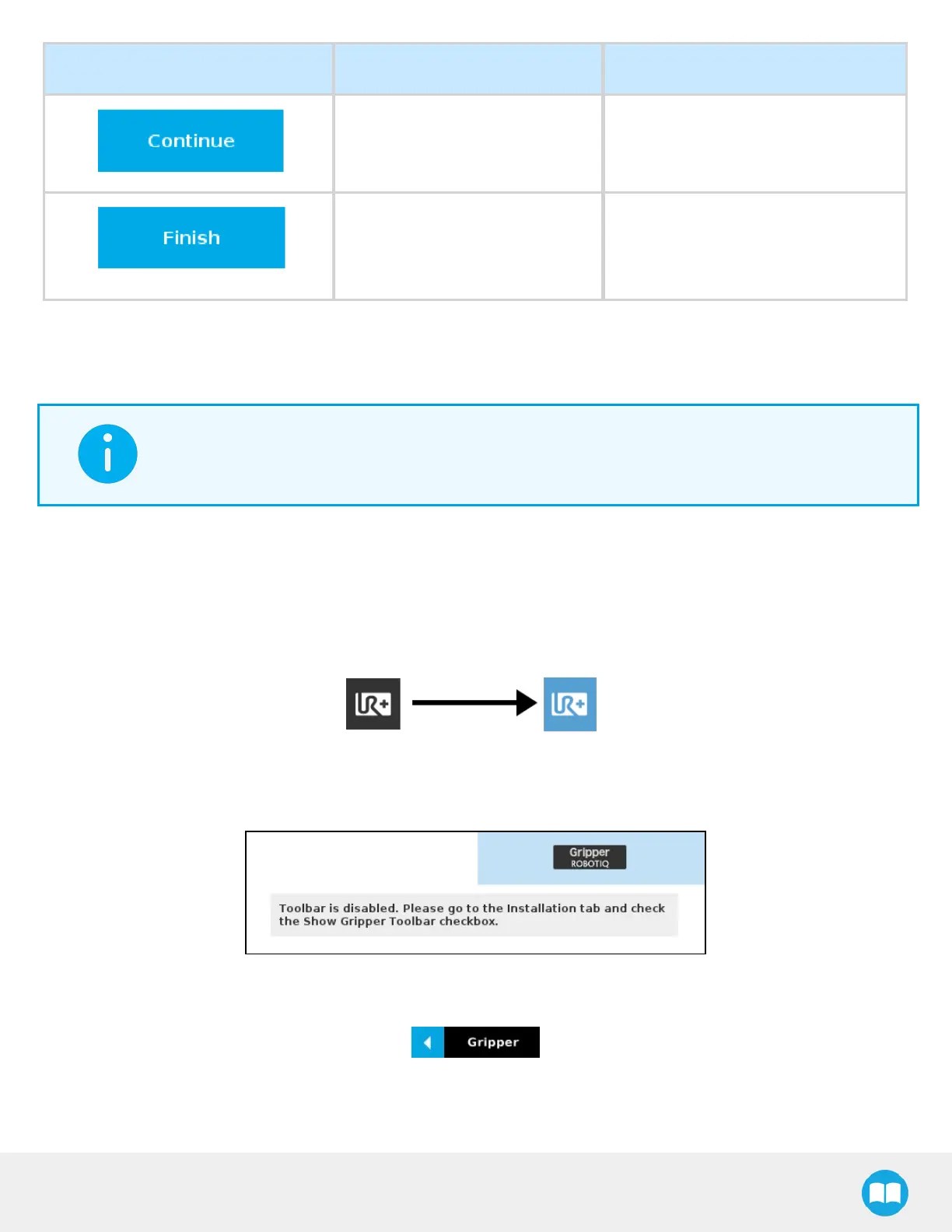 If the user has omitted to tick the Show Gripper Toolbar box in the Gripper Dashboard, tapping the UR+ button will display this