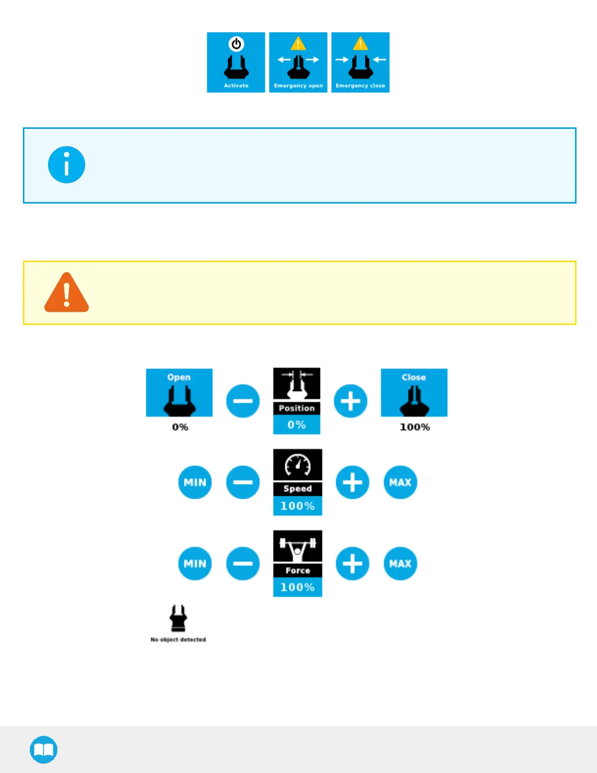 The Emergency open and Emergency close buttons allow the user to open and close the gripper even if it is