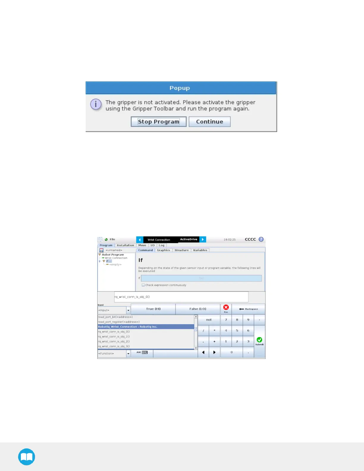 following message will be displayed in a popup. Tap Stop Program and activate the gripper with the toolbar to continue or add an