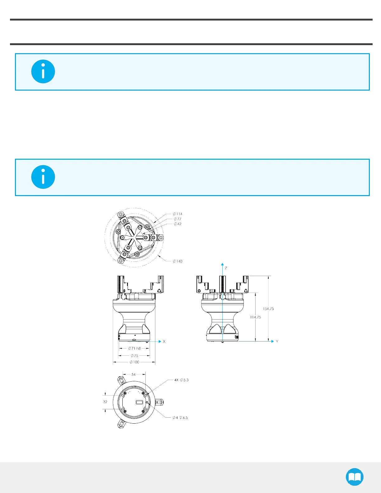 The figure below represents the gripper dimensions with axes X, Y, Z, and origin referenced for finger motion.