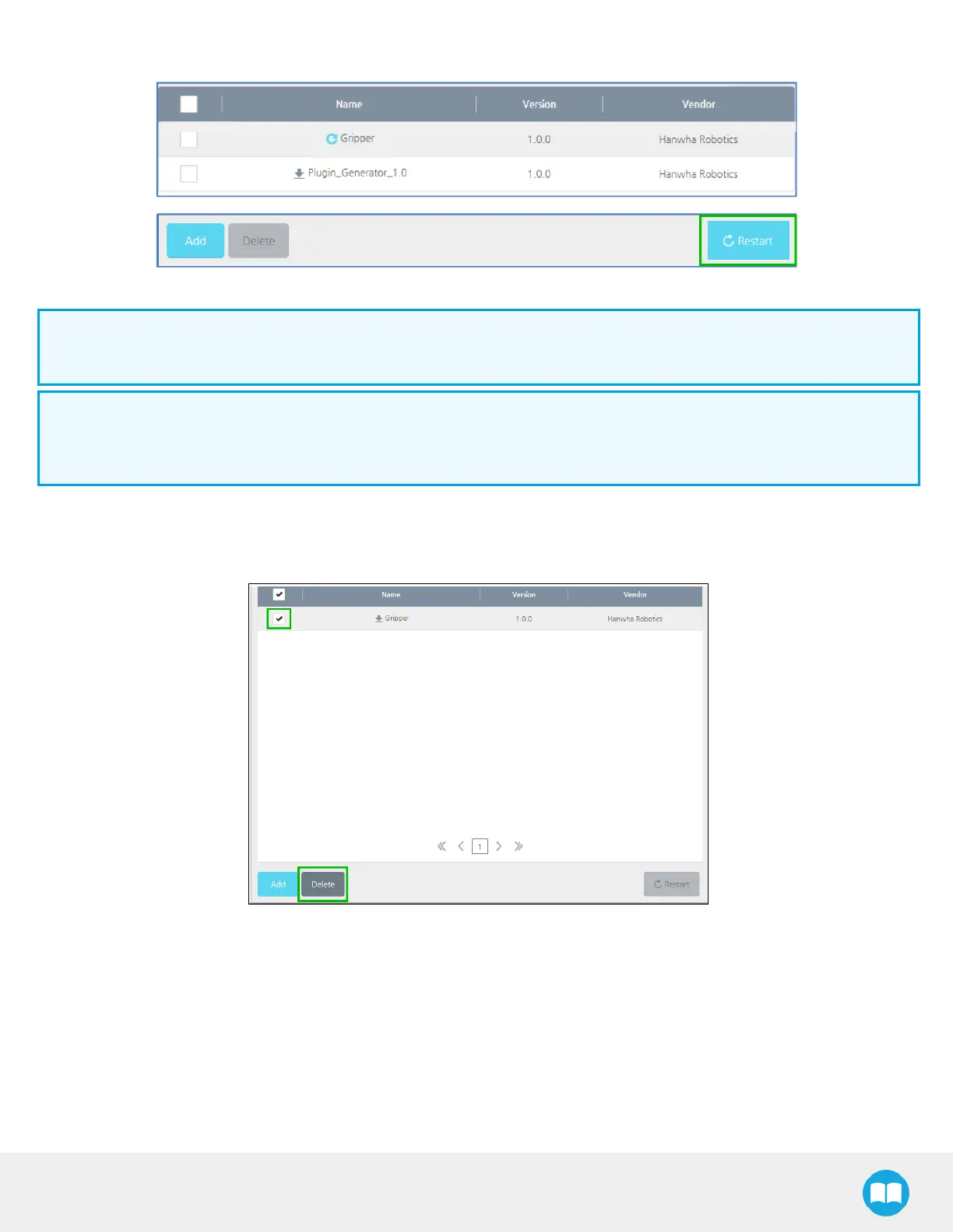 Fig. 3-11: Plugin Management menu with check box and Delete button highlighted.