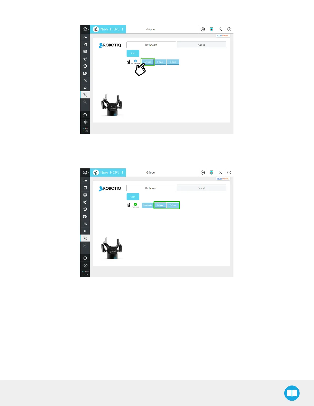 l In the dashboard, the Gripper can either be closed or opened, using the E-Open or E-Close button.